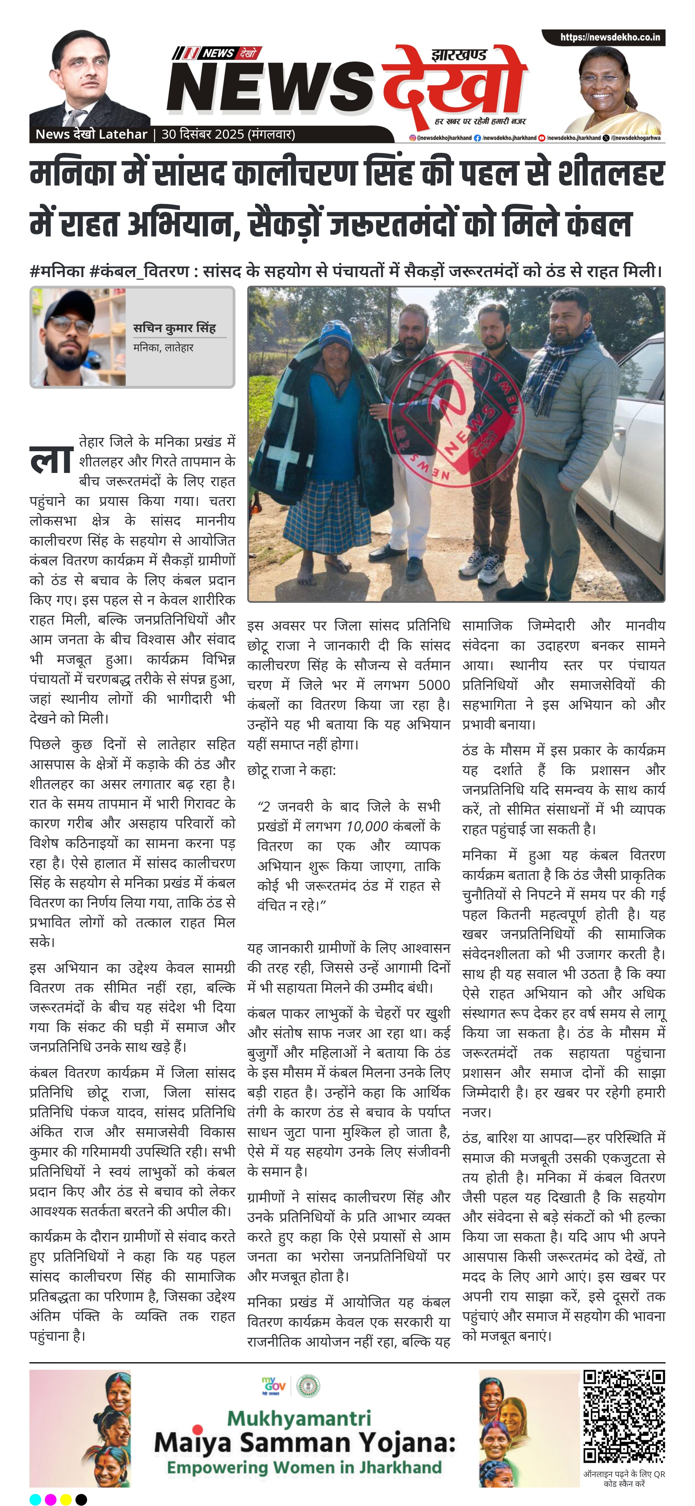 लातेहार जिले के मनिका प्रखंड में शीतलहर और गिरते तापमान के बीच जरूरतमंदों के लिए राहत पहुंचाने का प्रयास किया गया। चतरा लोकसभा क्षेत्र के सांसद माननीय कालीचरण सिंह के सहयोग से आयोजित कंबल वितरण कार्यक्रम में सैकड़ों ग्रामीणों को ठंड से बचाव के लिए कंबल प्रदान किए गए। इस पहल से न केवल शारीरिक राहत मिली, बल्कि जनप्रतिनिधियों और आम जनता के बीच विश्वास और संवाद भी मजबूत हुआ। कार्यक्रम विभिन्न पंचायतों में चरणबद्ध तरीके से संपन्न हुआ, जहां स्थानीय लोगों की भागीदारी भी देखने को मिली।