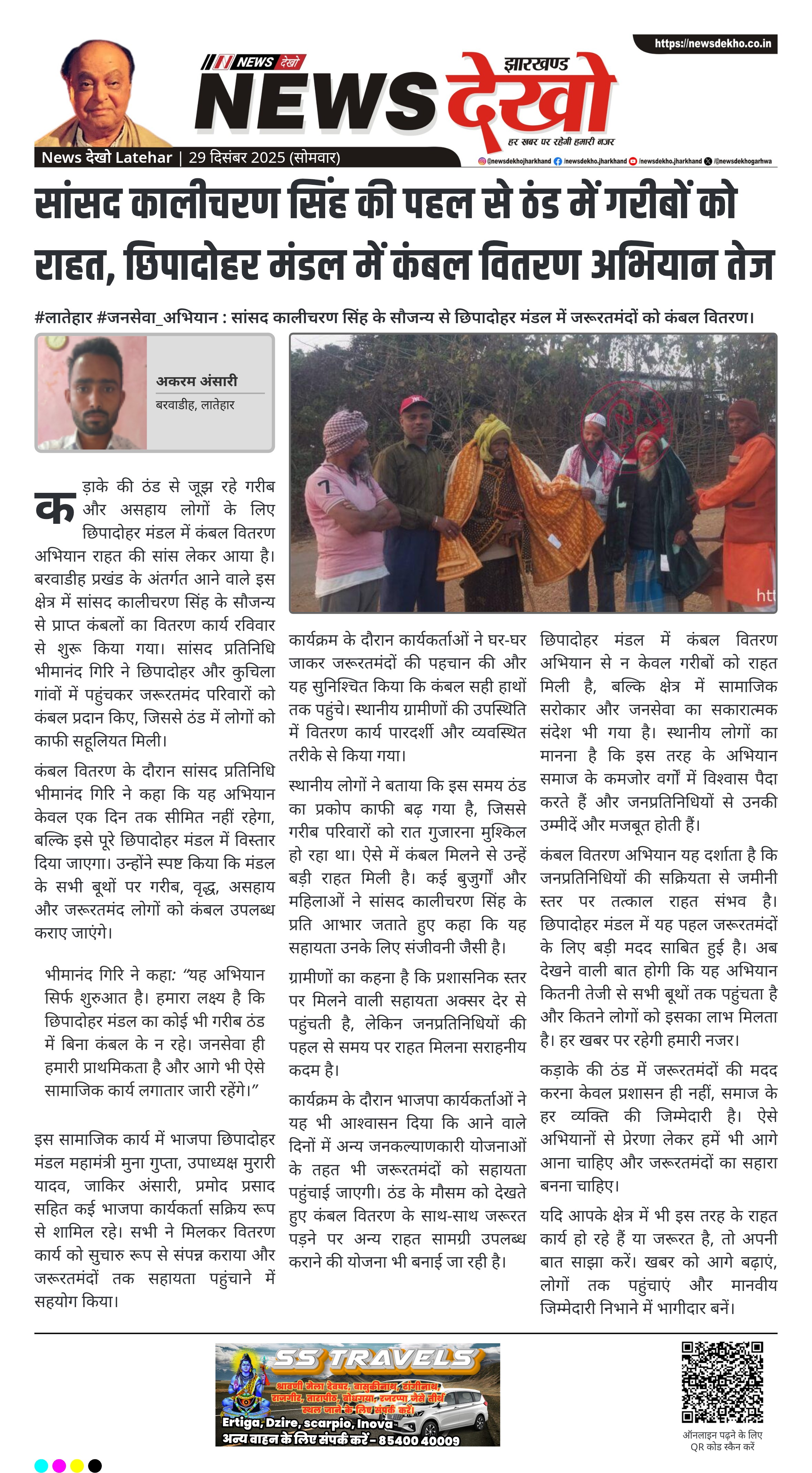• सांसद कालीचरण सिंह के सौजन्य से कंबल वितरण अभियान शुरू।
