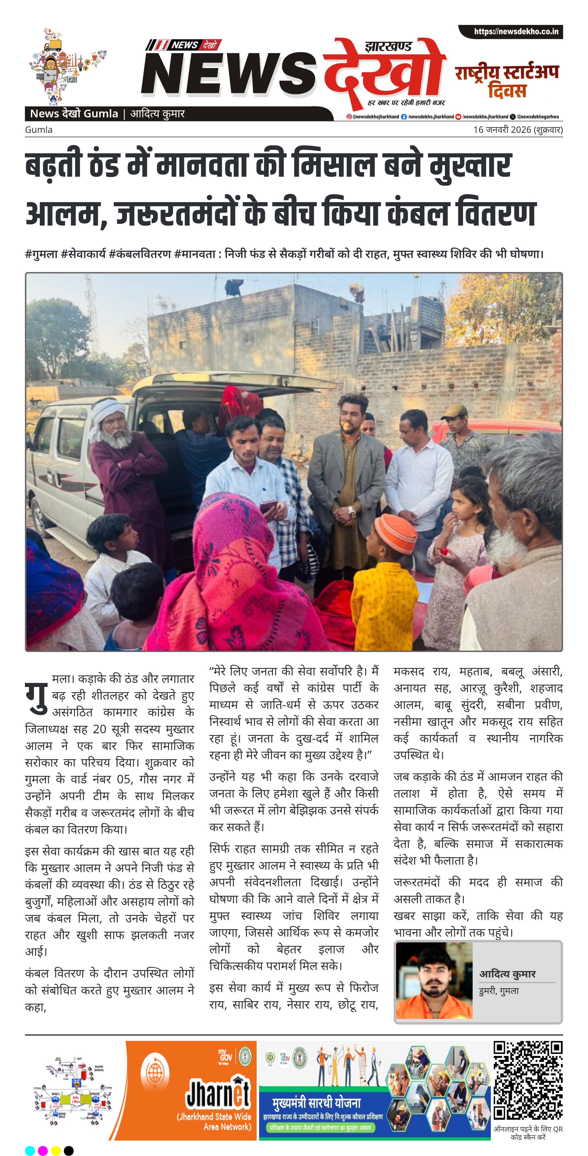 कड़ाके की ठंड और शीतलहर के बीच गुमला में समाजसेवा की एक प्रेरणादायक तस्वीर सामने आई, जहां असंगठित कामगार कांग्रेस के जिलाध्यक्ष सह 20 सूत्री सदस्य मुख्तार आलम ने जरूरतमंदों के बीच कंबल वितरण कर मानवता की मिसाल पेश की। निजी संसाधनों से किए गए इस सेवा कार्य ने ठंड से जूझ रहे लोगों को बड़ी राहत दी।