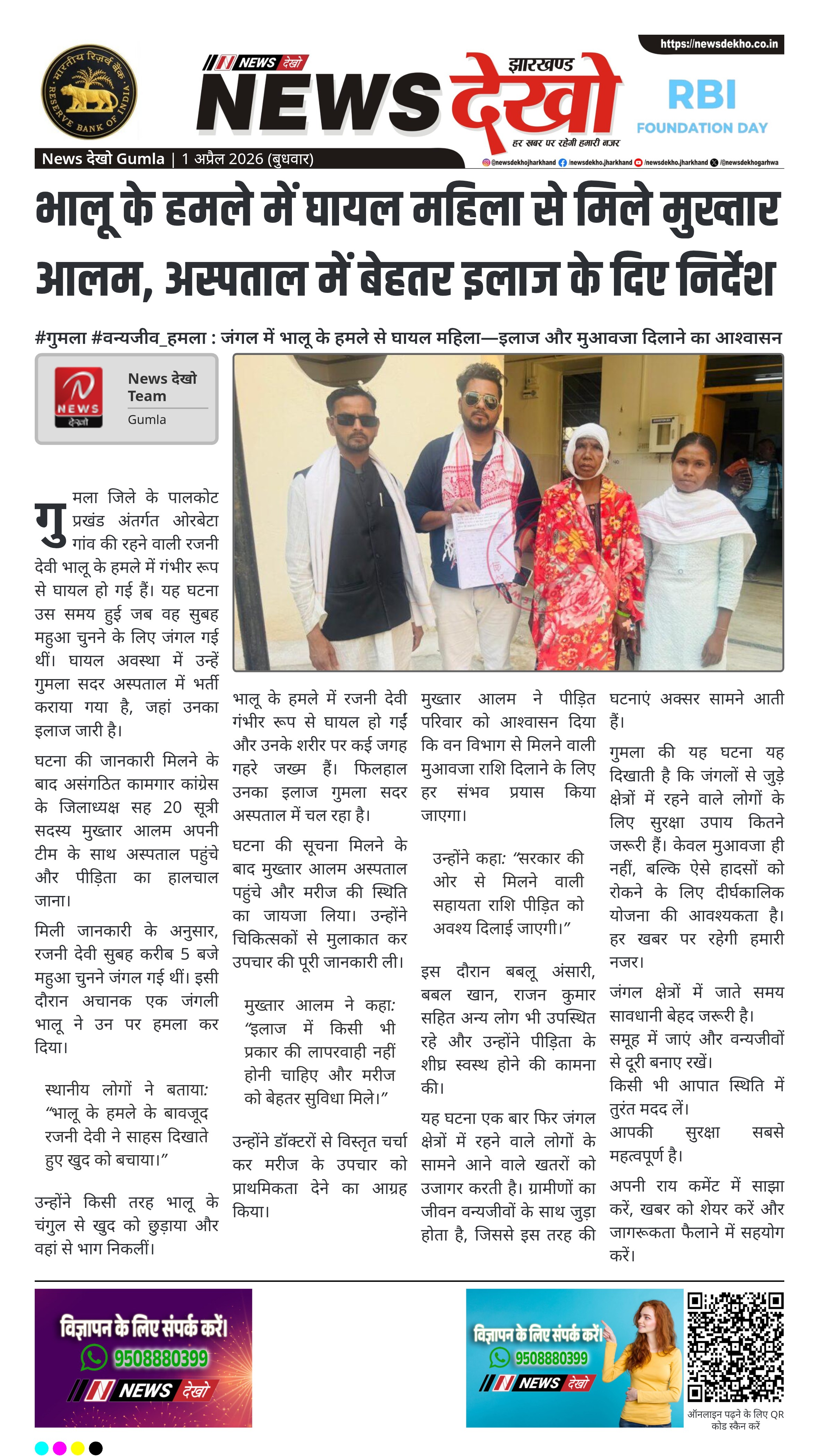 #गुमला #वन्यजीव_हमला : जंगल में भालू के हमले से घायल महिला—इलाज और मुआवजा दिलाने का आश्वासन।