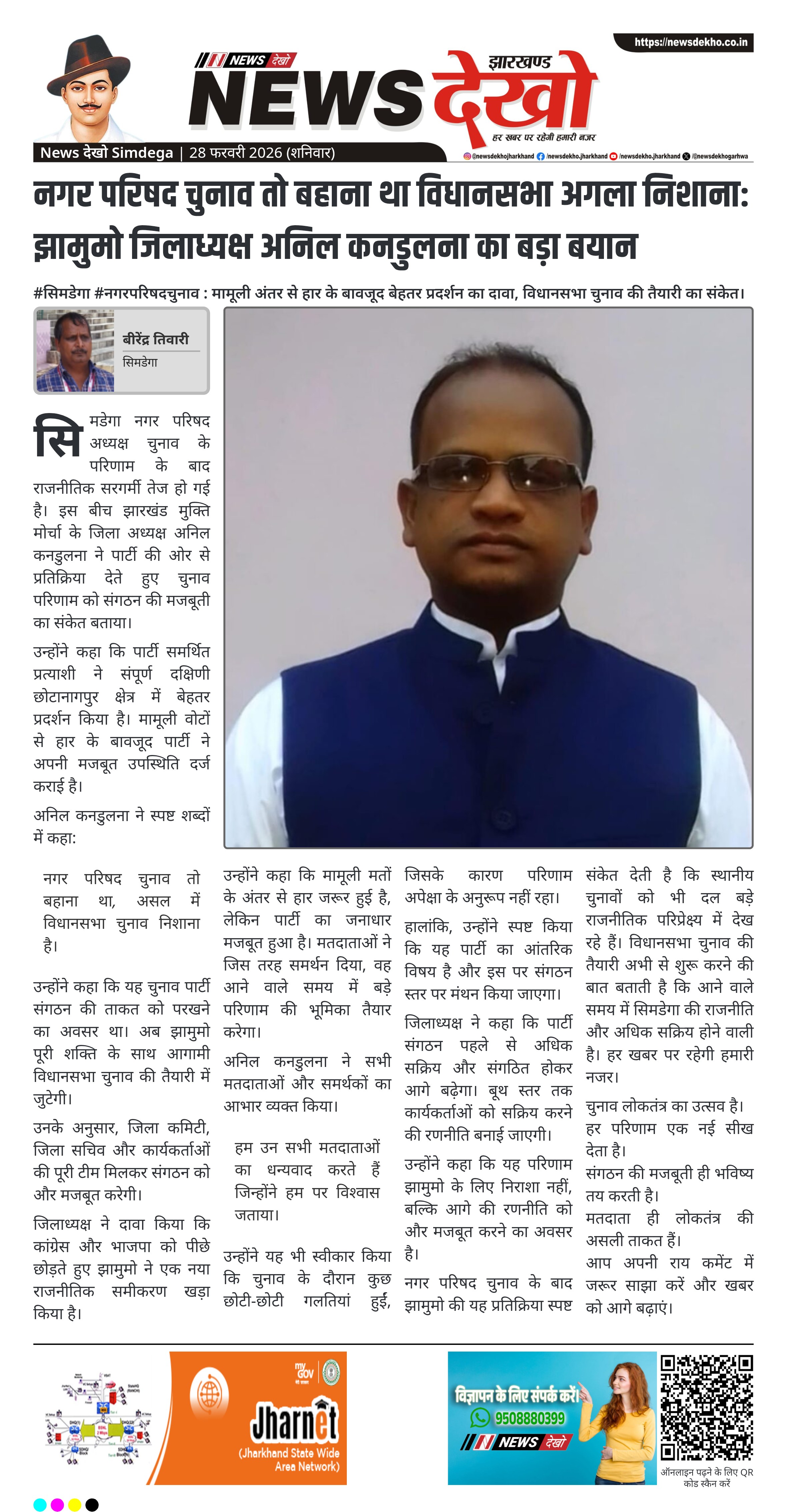सिमडेगा नगर परिषद अध्यक्ष चुनाव के परिणाम के बाद राजनीतिक सरगर्मी तेज हो गई है। इस बीच झारखंड मुक्ति मोर्चा के जिला अध्यक्ष अनिल कनडुलना ने पार्टी की ओर से प्रतिक्रिया देते हुए चुनाव परिणाम को संगठन की मजबूती का संकेत बताया।