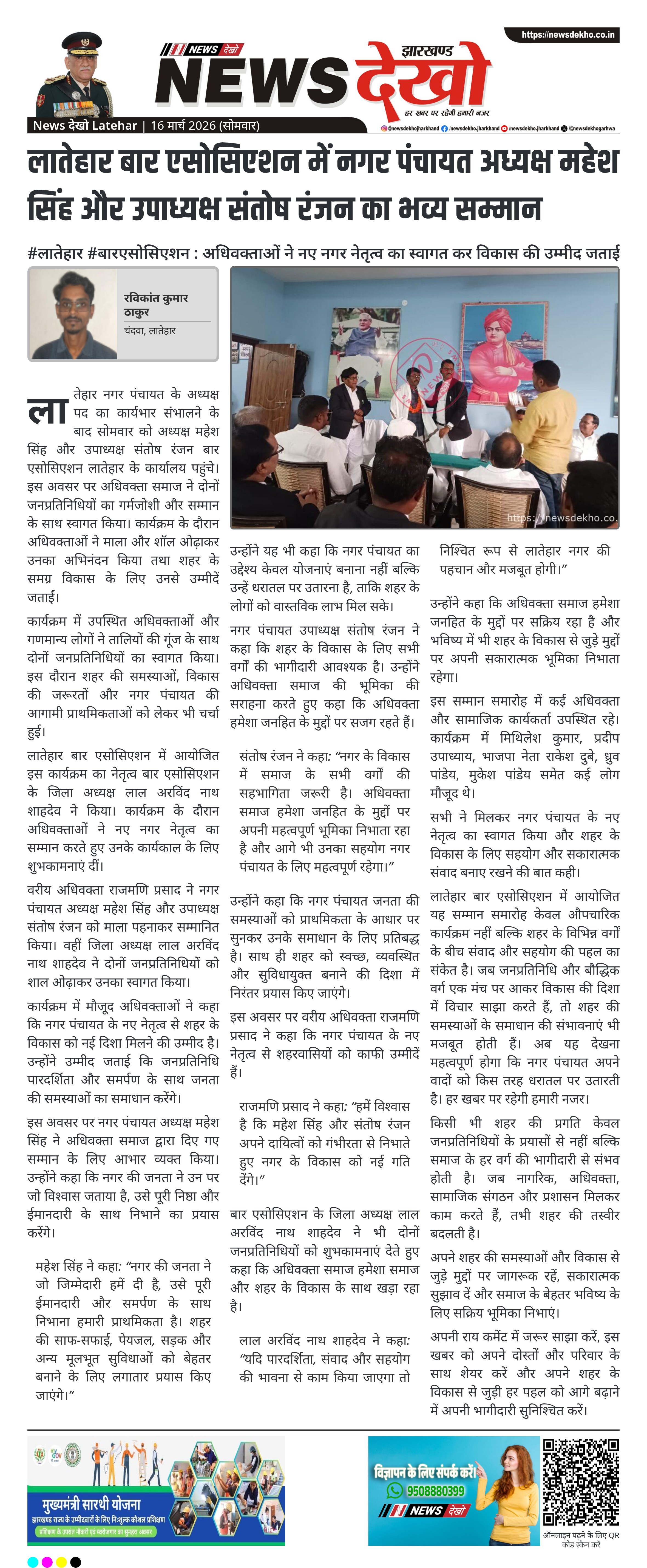• नगर पंचायत अध्यक्ष महेश सिंह और उपाध्यक्ष संतोष रंजन का लातेहार बार एसोसिएशन में सम्मान।
