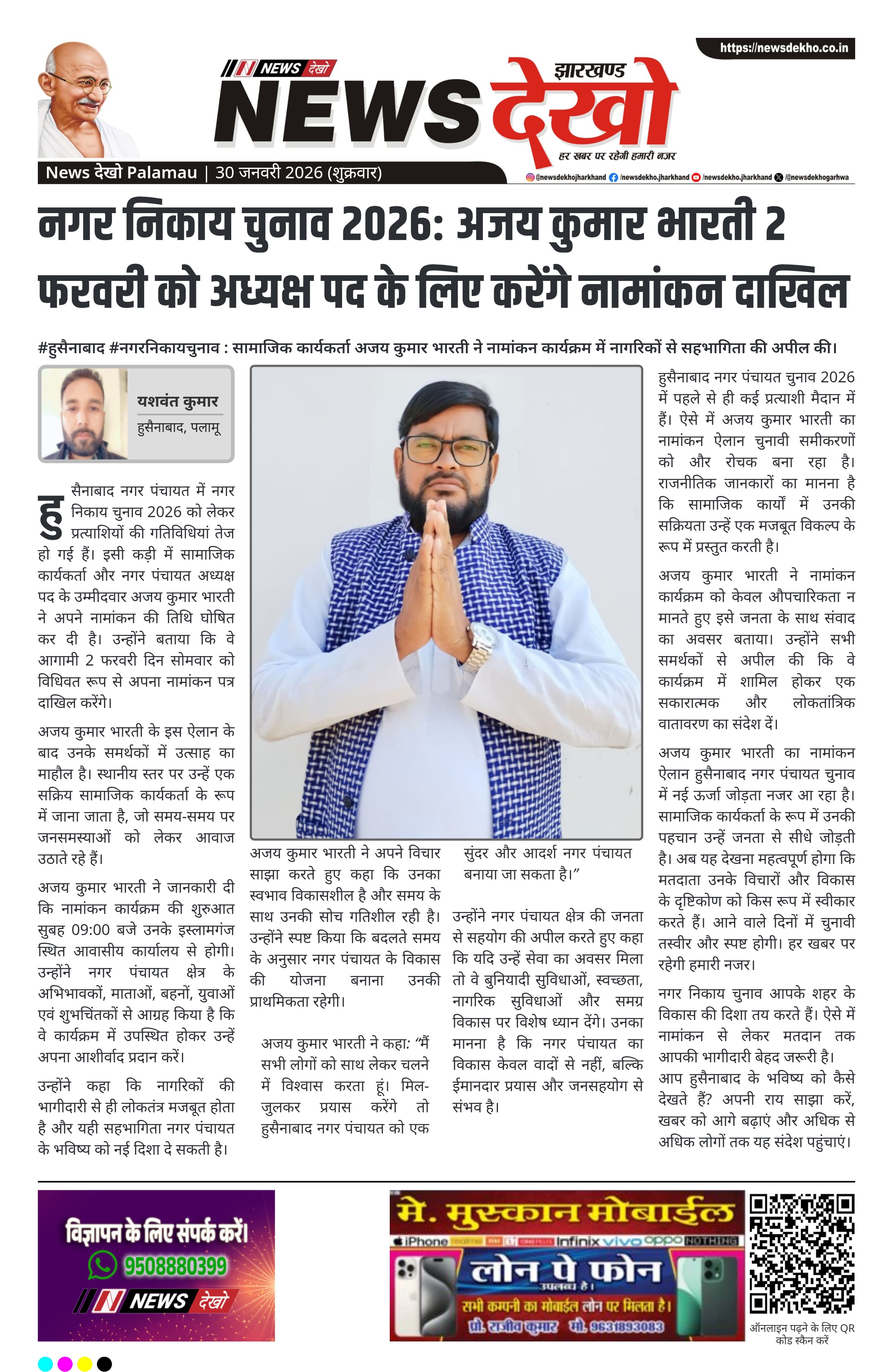हुसैनाबाद नगर पंचायत में नगर निकाय चुनाव 2026 को लेकर राजनीतिक गतिविधियां लगातार तेज होती जा रही हैं। सामाजिक कार्यकर्ता एवं नगर पंचायत अध्यक्ष पद के उम्मीदवार अजय कुमार भारती ने 2 फरवरी को नामांकन दाखिल करने की घोषणा की है। उन्होंने अपने समर्थकों और नगरवासियों से नामांकन कार्यक्रम में शामिल होने की अपील की है। इस ऐलान के बाद चुनावी माहौल में नई सक्रियता देखी जा रही है।