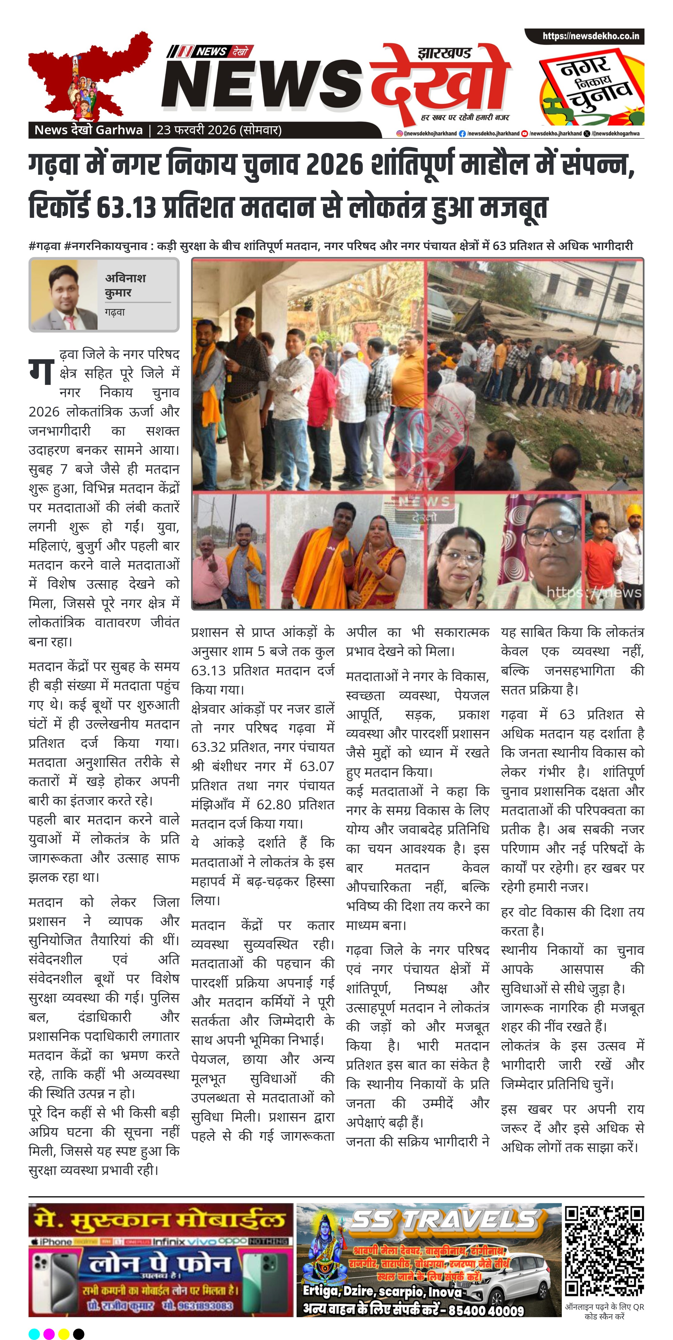 गढ़वा में 63 प्रतिशत से अधिक मतदान यह दर्शाता है कि जनता स्थानीय विकास को लेकर गंभीर है। शांतिपूर्ण चुनाव प्रशासनिक दक्षता और मतदाताओं की परिपक्वता का प्रतीक है। अब सबकी नजर परिणाम और नई परिषदों के कार्यों पर रहेगी। हर खबर पर रहेगी हमारी नजर।