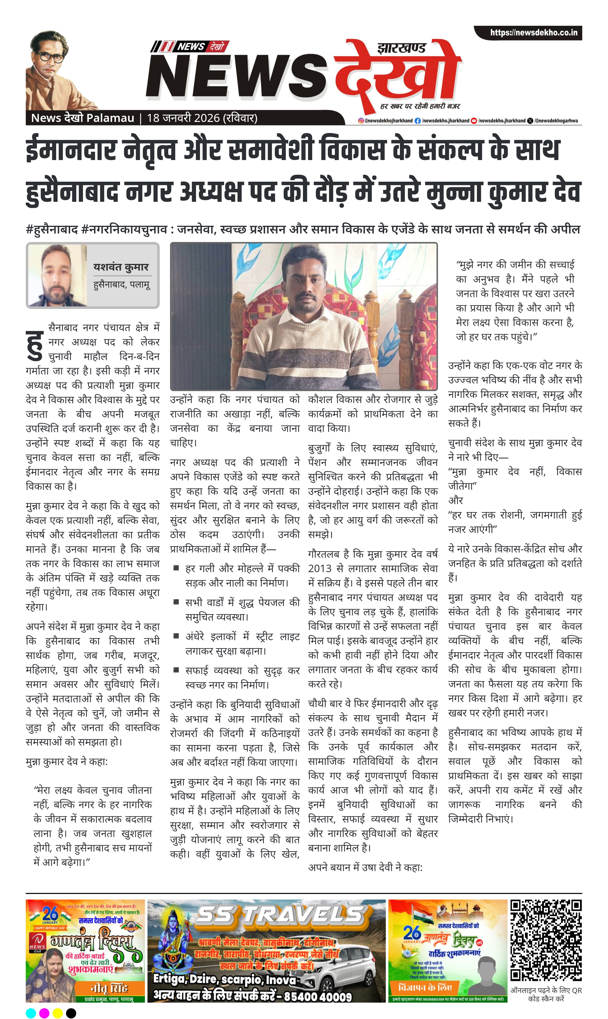 मुन्ना कुमार देव की दावेदारी यह संकेत देती है कि हुसैनाबाद नगर पंचायत चुनाव इस बार केवल व्यक्तियों के बीच नहीं, बल्कि ईमानदार नेतृत्व और पारदर्शी विकास की सोच के बीच मुकाबला होगा। जनता का फैसला यह तय करेगा कि नगर किस दिशा में आगे बढ़ेगा। हर खबर पर रहेगी हमारी नजर।