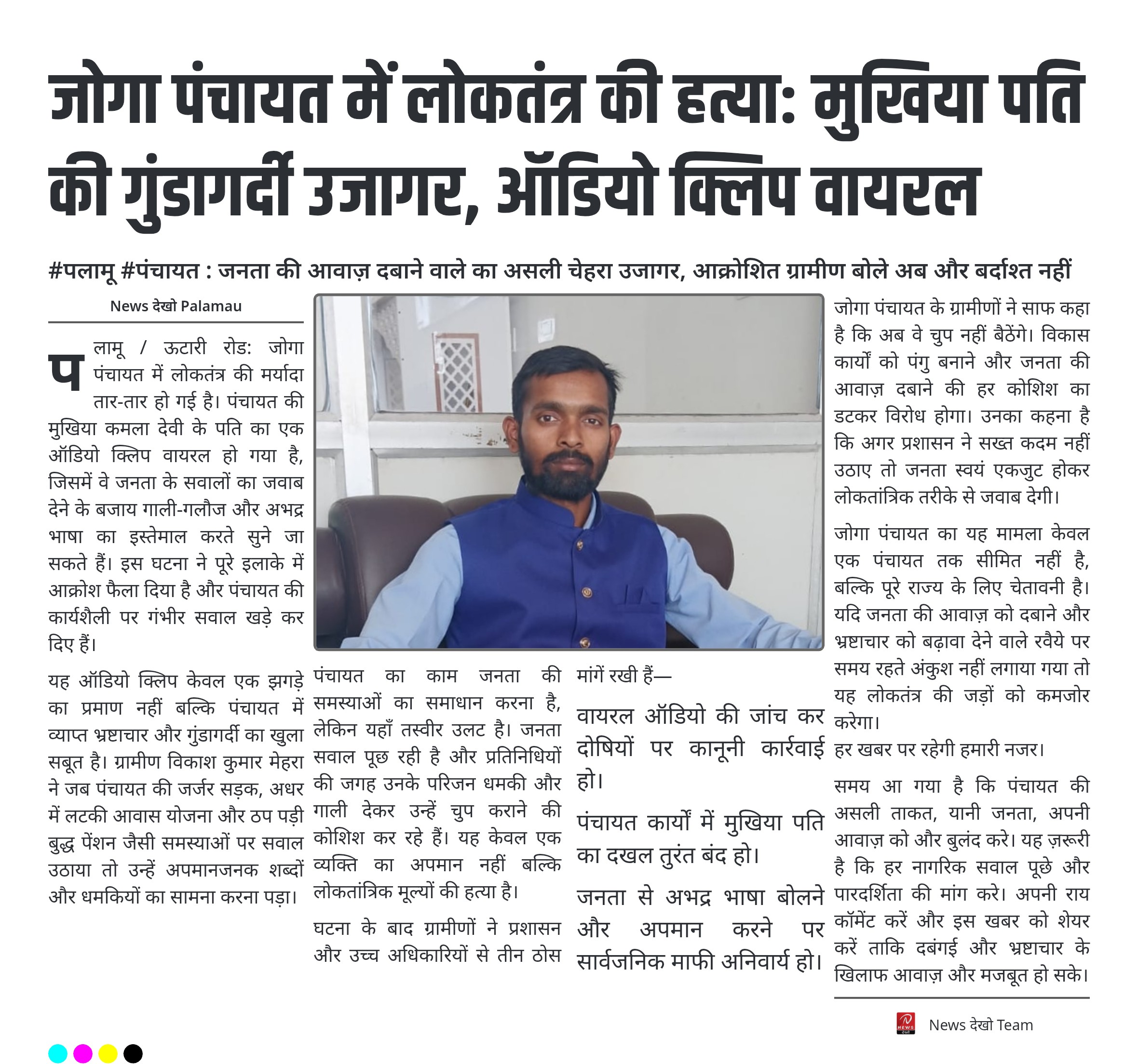 पलामू / ऊटारी रोड: जोगा पंचायत में लोकतंत्र की मर्यादा तार-तार हो गई है। पंचायत की मुखिया कमला देवी के पति का एक ऑडियो क्लिप वायरल हो गया है, जिसमें वे जनता के सवालों का जवाब देने के बजाय गाली-गलौज और अभद्र भाषा का इस्तेमाल करते सुने जा सकते हैं। इस घटना ने पूरे इलाके में आक्रोश फैला दिया है और पंचायत की कार्यशैली पर गंभीर सवाल खड़े कर दिए हैं।