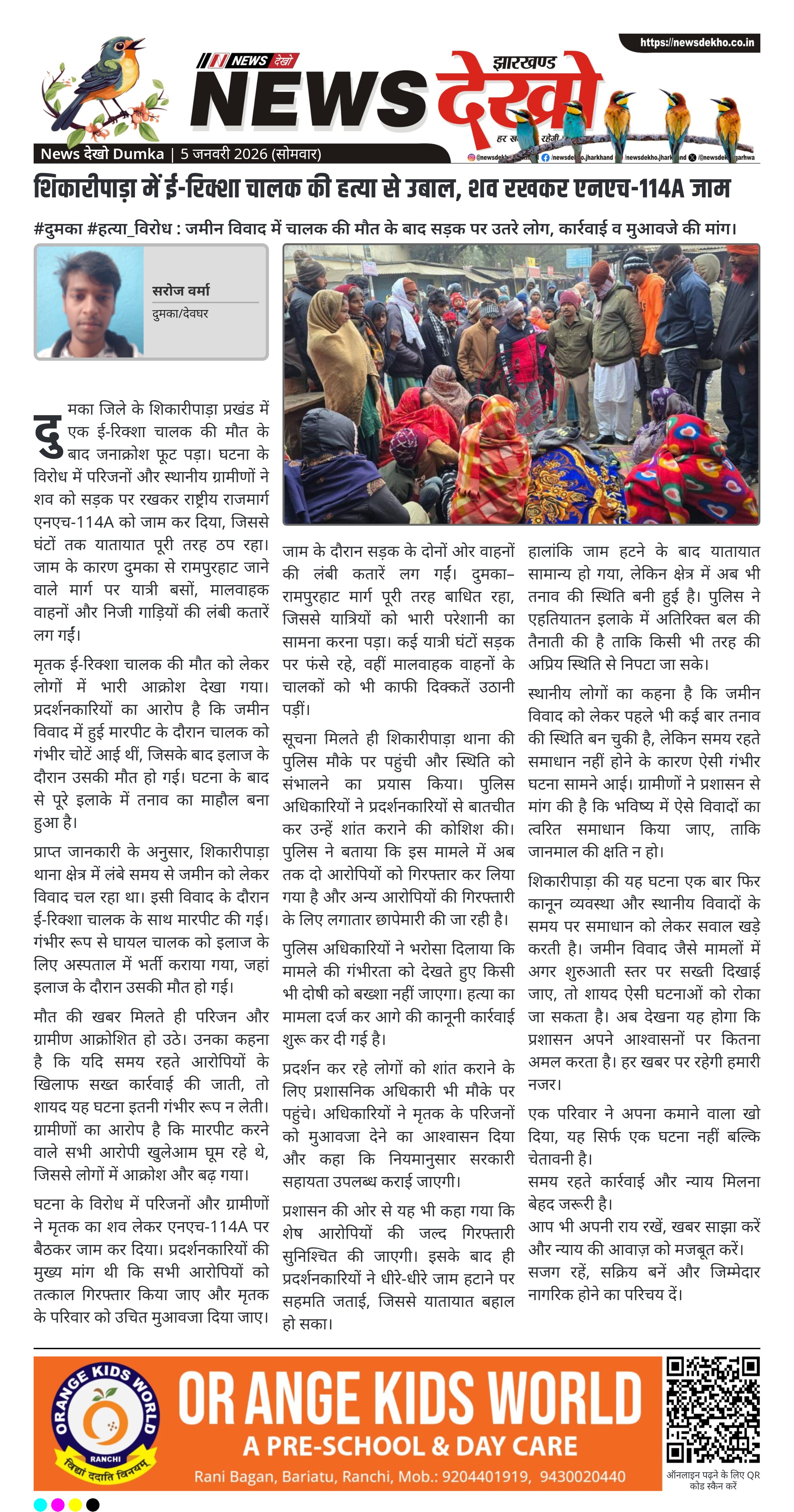 दुमका जिले के शिकारीपाड़ा प्रखंड में एक ई-रिक्शा चालक की मौत के बाद जनाक्रोश फूट पड़ा। घटना के विरोध में परिजनों और स्थानीय ग्रामीणों ने शव को सड़क पर रखकर राष्ट्रीय राजमार्ग एनएच-114A को जाम कर दिया, जिससे घंटों तक यातायात पूरी तरह ठप रहा। जाम के कारण दुमका से रामपुरहाट जाने वाले मार्ग पर यात्री बसों, मालवाहक वाहनों और निजी गाड़ियों की लंबी कतारें लग गईं।
