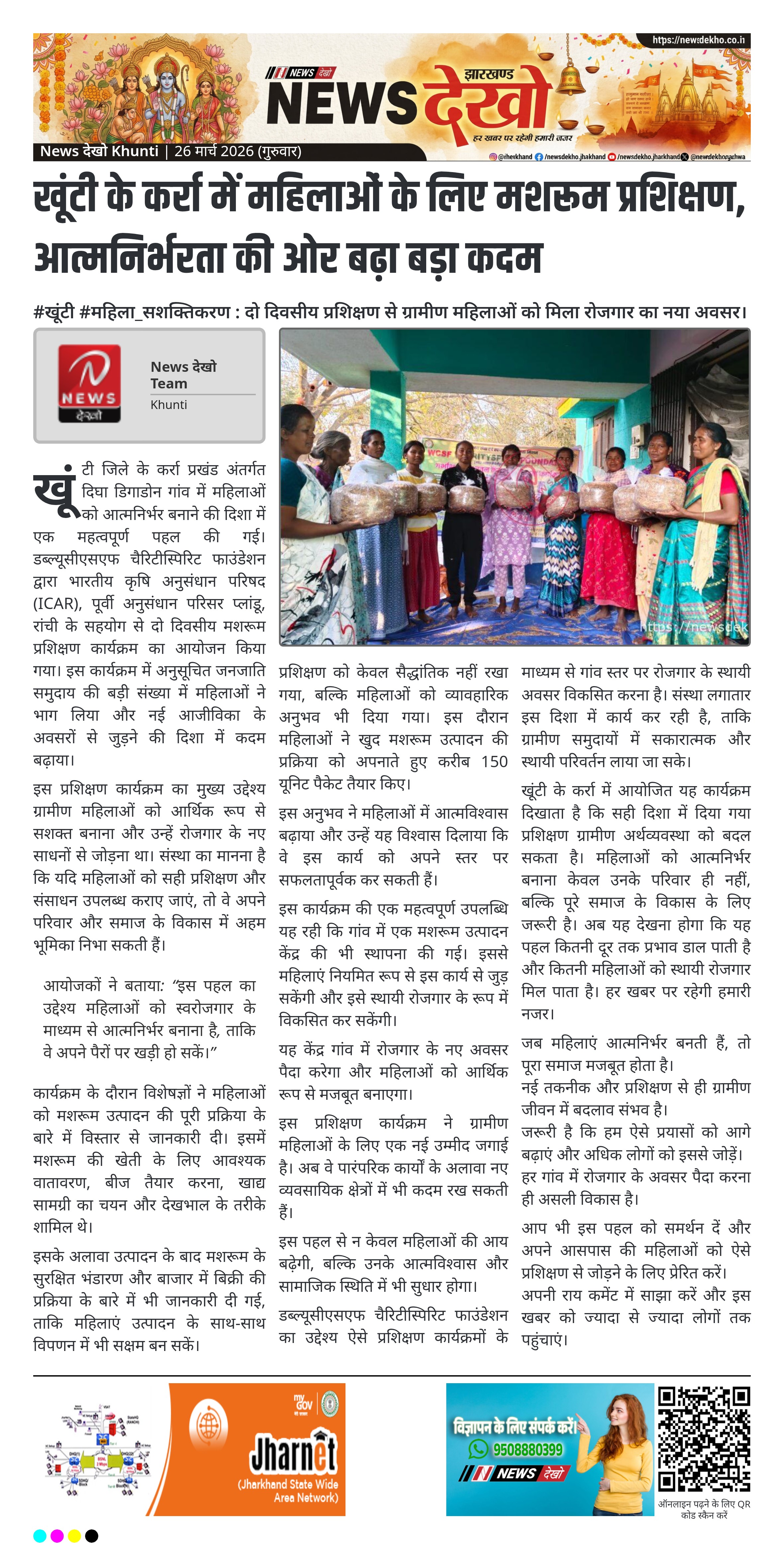 खूंटी जिले के कर्रा प्रखंड अंतर्गत दिघा डिगाडोन गांव में महिलाओं को आत्मनिर्भर बनाने की दिशा में एक महत्वपूर्ण पहल की गई। डब्ल्यूसीएसएफ चैरिटीस्पिरिट फाउंडेशन द्वारा भारतीय कृषि अनुसंधान परिषद (ICAR), पूर्वी अनुसंधान परिसर प्लांडू, रांची के सहयोग से दो दिवसीय मशरूम प्रशिक्षण कार्यक्रम का आयोजन किया गया। इस कार्यक्रम में अनुसूचित जनजाति समुदाय की बड़ी संख्या में महिलाओं ने भाग लिया और नई आजीविका के अवसरों से जुड़ने की दिशा में कदम बढ़ाया।