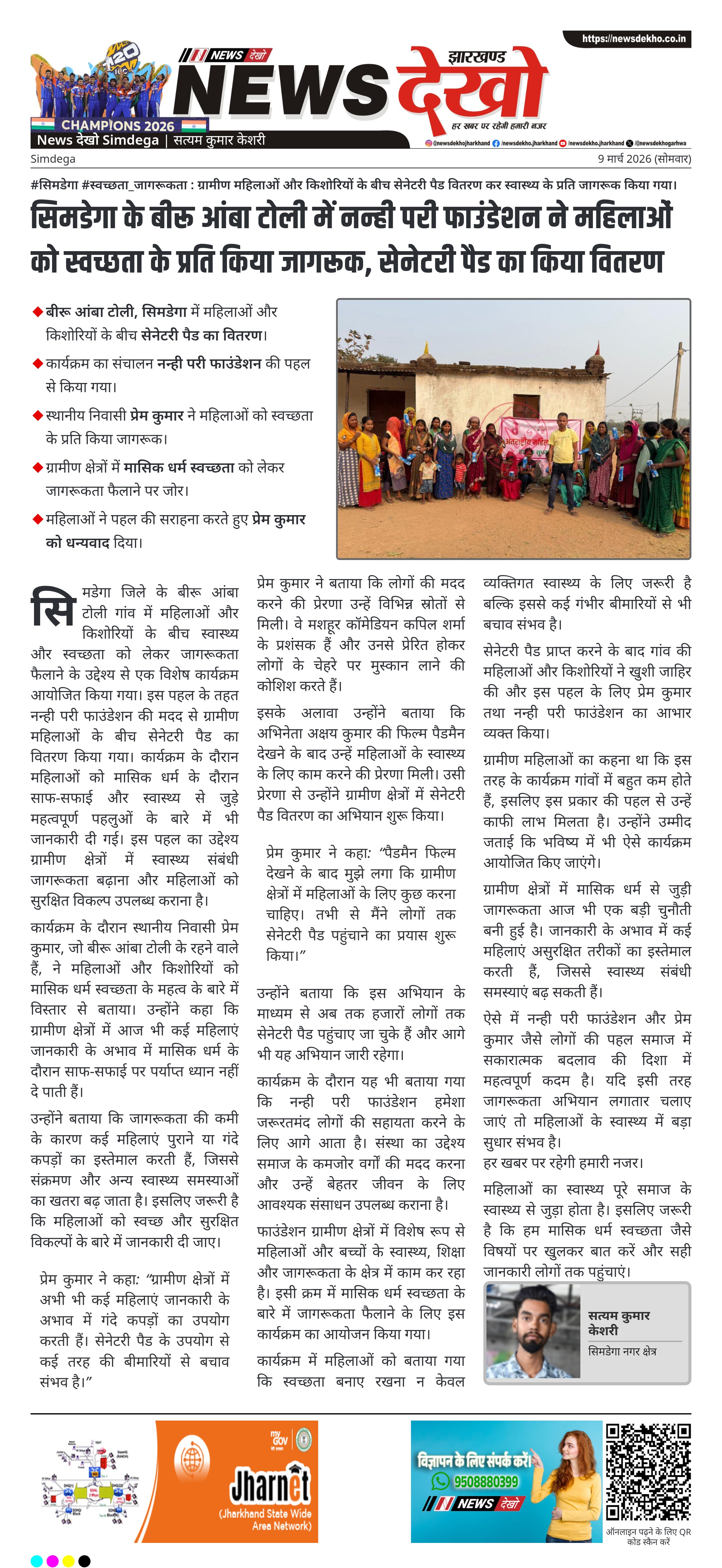 सिमडेगा जिले के बीरू आंबा टोली गांव में महिलाओं और किशोरियों के बीच स्वास्थ्य और स्वच्छता को लेकर जागरूकता फैलाने के उद्देश्य से एक विशेष कार्यक्रम आयोजित किया गया। इस पहल के तहत नन्ही परी फाउंडेशन की मदद से ग्रामीण महिलाओं के बीच सेनेटरी पैड का वितरण किया गया। कार्यक्रम के दौरान महिलाओं को मासिक धर्म के दौरान साफ-सफाई और स्वास्थ्य से जुड़े महत्वपूर्ण पहलुओं के बारे में भी जानकारी दी गई। इस पहल का उद्देश्य ग्रामीण क्षेत्रों में स्वास्थ्य संबंधी जागरूकता बढ़ाना और महिलाओं को सुरक्षित विकल्प उपलब्ध कराना है।