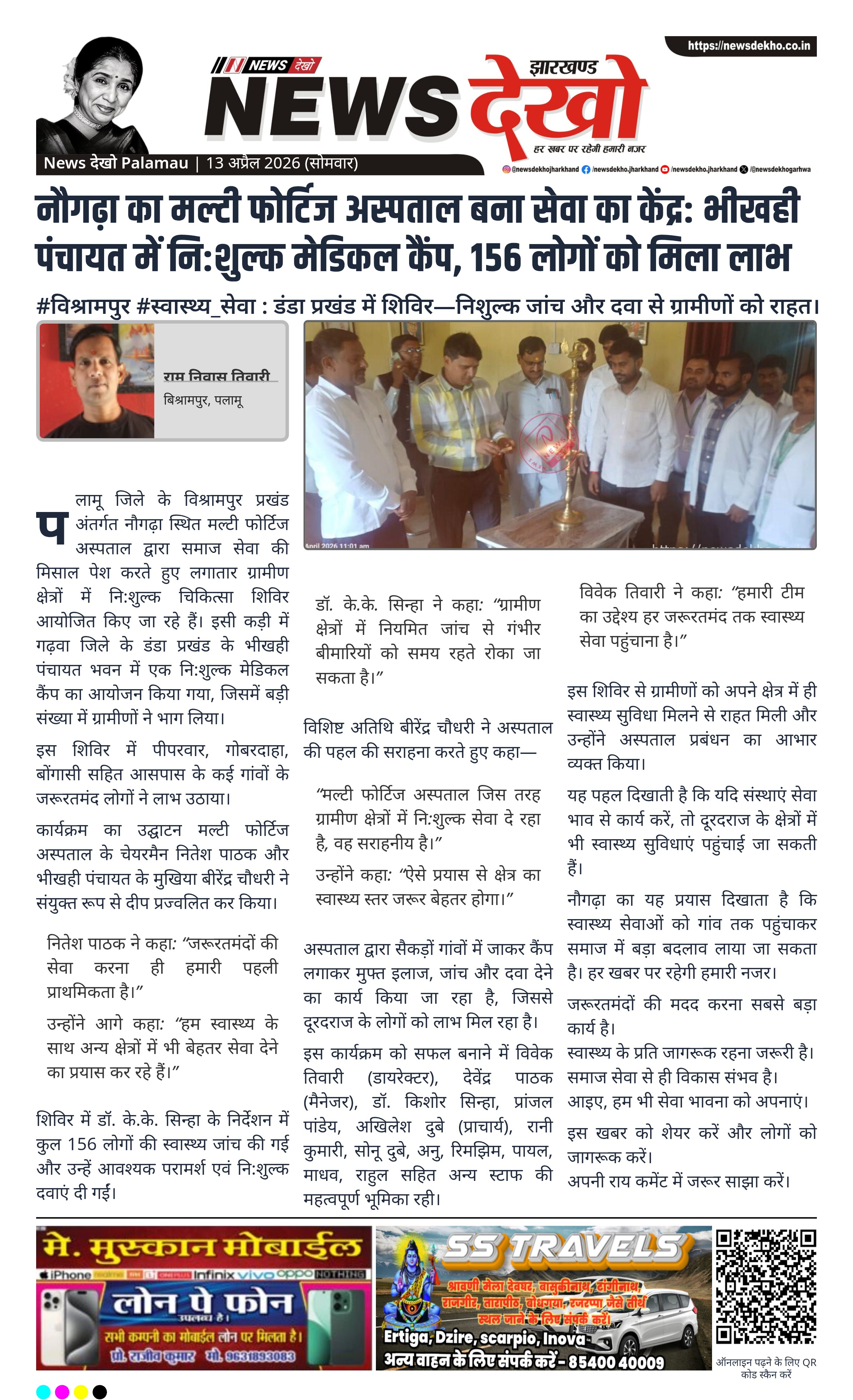 पलामू के विश्रामपुर प्रखंड के नौगढ़ा स्थित मल्टी फोर्टिज अस्पताल ने डंडा प्रखंड में नि:शुल्क स्वास्थ्य शिविर लगाया। इसमें 156 लोगों का इलाज किया गया। अस्पताल प्रबंधन ने सेवा को प्राथमिकता बताया। स्थानीय जनप्रतिनिधियों ने पहल की सराहना की।
