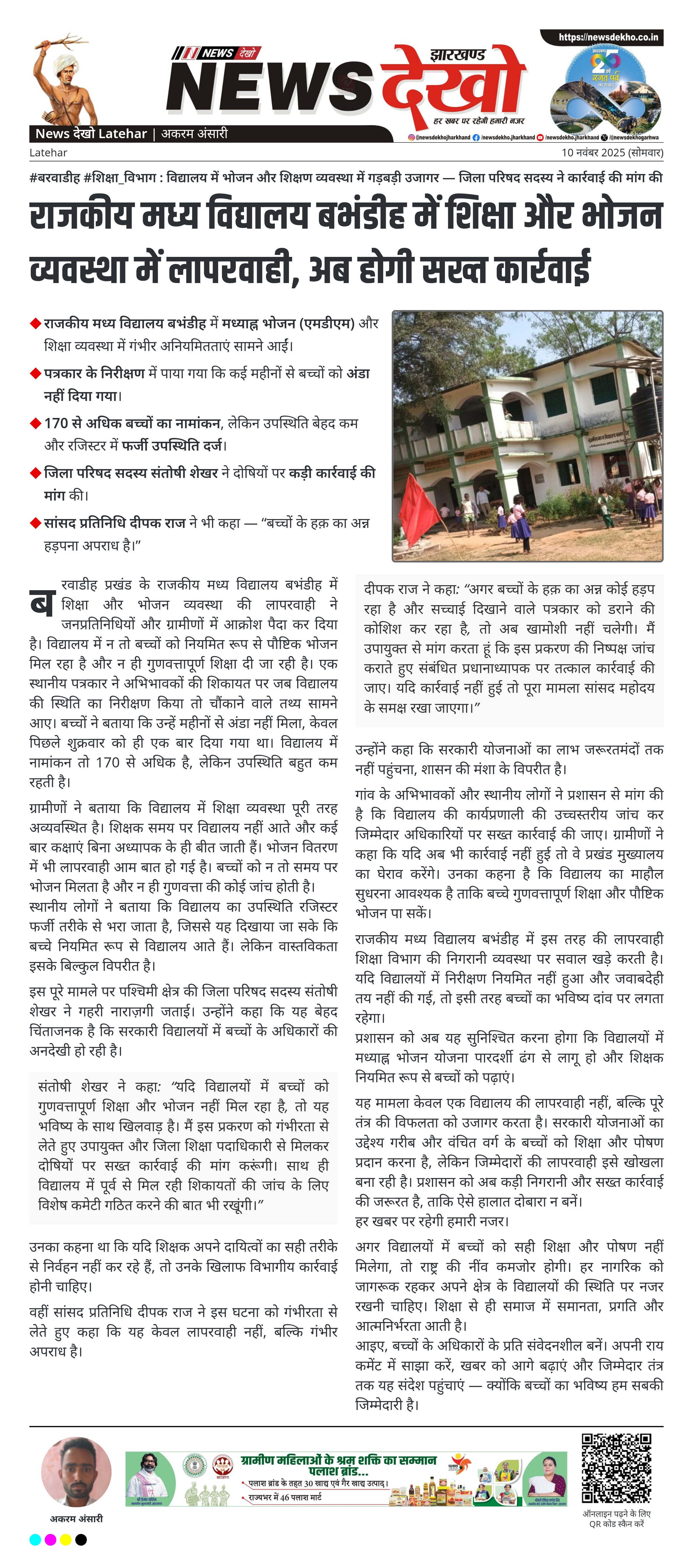 • राजकीय मध्य विद्यालय बभंडीह में मध्याह्न भोजन (एमडीएम) और शिक्षा व्यवस्था में गंभीर अनियमितताएं सामने आईं।