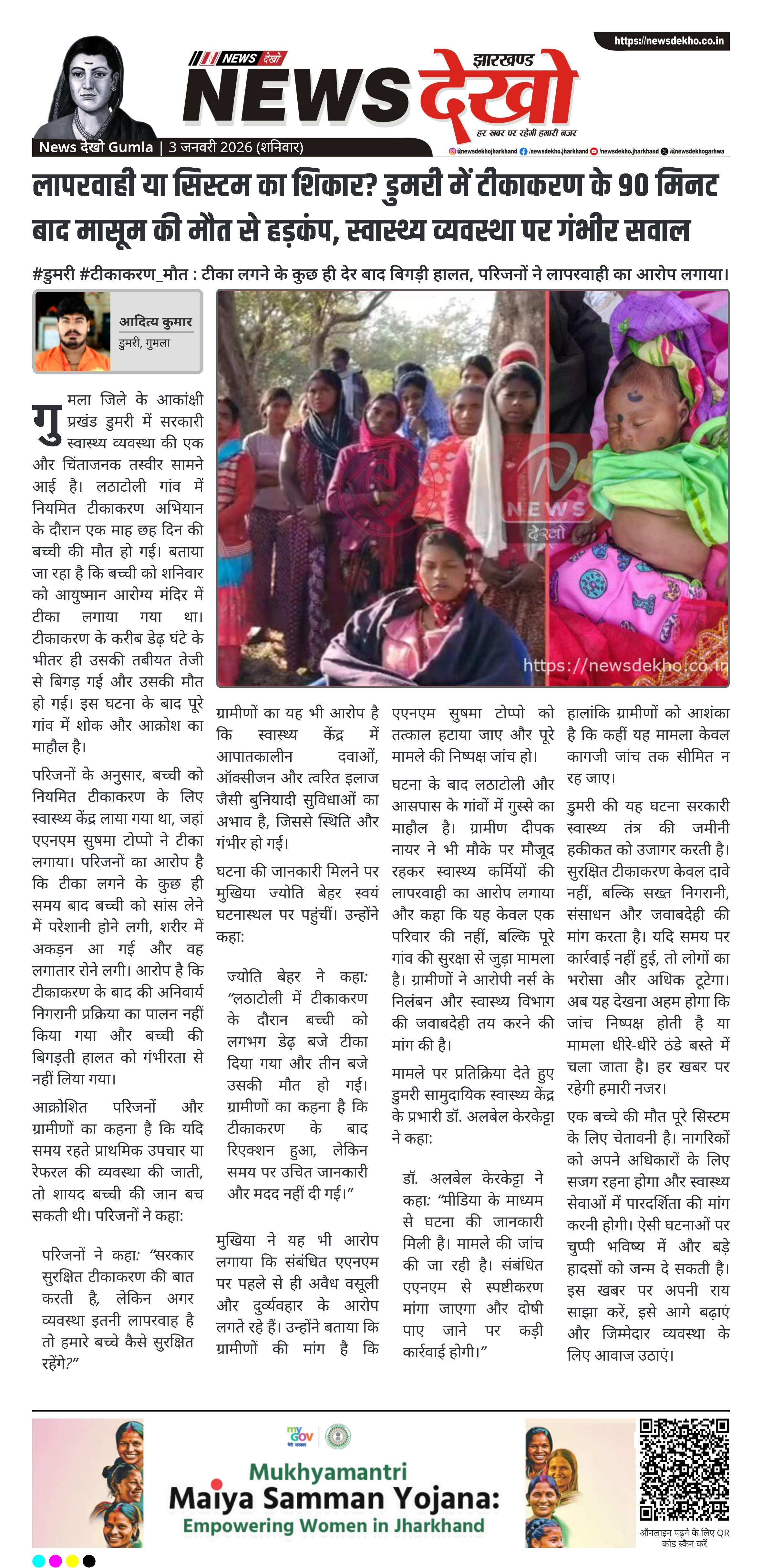 गुमला जिले के डुमरी प्रखंड के लठाटोली गांव में सरकारी टीकाकरण अभियान के दौरान एक माह छह दिन की बच्ची की मौत से हड़कंप मच गया है। परिजनों का आरोप है कि आयुष्मान आरोग्य मंदिर में टीका लगने के लगभग 90 मिनट बाद बच्ची की हालत अचानक बिगड़ गई और उसकी मौत हो गई। घटना ने न केवल परिवार को गहरे सदमे में डाल दिया है, बल्कि आकांक्षी प्रखंड में स्वास्थ्य सेवाओं की गुणवत्ता और निगरानी व्यवस्था पर भी गंभीर सवाल खड़े कर दिए हैं। मामले को लेकर ग्रामीणों में आक्रोश है और दोषियों पर कार्रवाई की मांग तेज हो गई है।