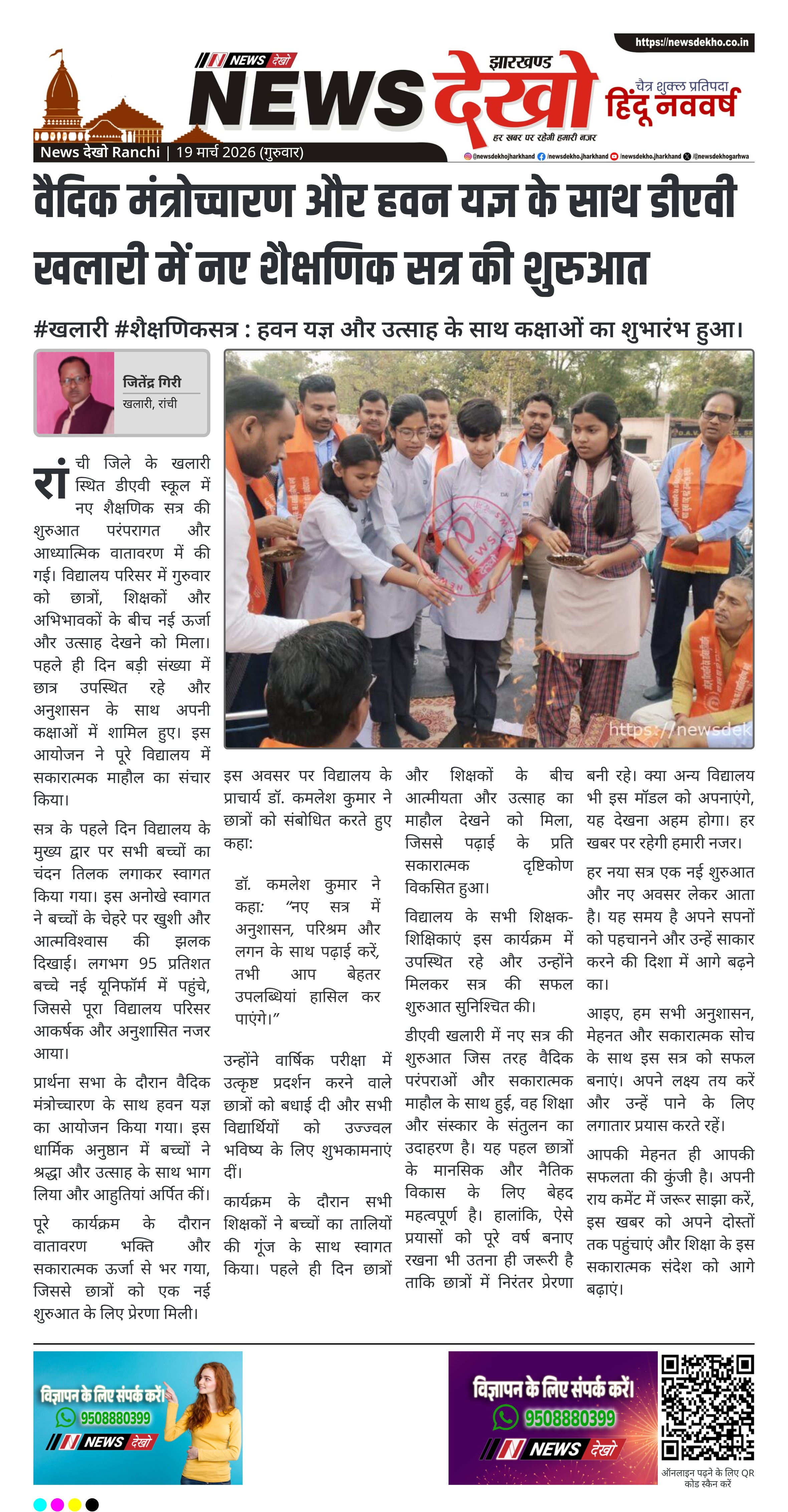 रांची जिले के खलारी स्थित डीएवी स्कूल में नए शैक्षणिक सत्र 2026-27 की शुरुआत वैदिक मंत्रोच्चारण और हवन यज्ञ के साथ की गई। नर्सरी से आठवीं तक की कक्षाएं 19 मार्च से प्रारंभ हुईं, जिसमें बड़ी संख्या में छात्र शामिल हुए। पहले दिन 95 प्रतिशत बच्चे नई यूनिफॉर्म में पहुंचे, जिससे विद्यालय परिसर में उत्साह का माहौल बना रहा। यह आयोजन सकारात्मक ऊर्जा और अनुशासन का संदेश देने वाला रहा।