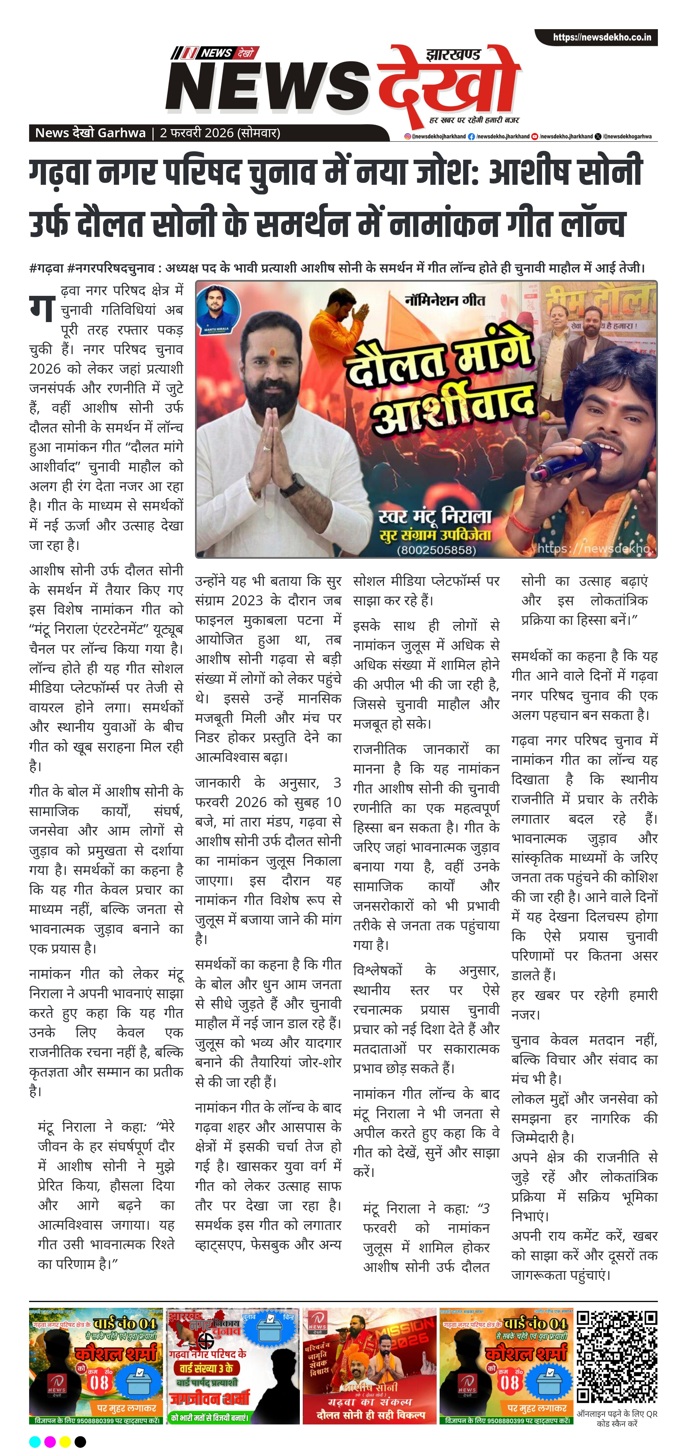 गढ़वा नगर परिषद चुनाव 2026 को लेकर राजनीतिक गतिविधियां तेज हो गई हैं। अध्यक्ष पद के भावी प्रत्याशी आशीष सोनी उर्फ दौलत सोनी के समर्थन में एक विशेष नामांकन गीत को यूट्यूब पर लॉन्च किया गया है। यह गीत भोजपुरी सिंगिंग रियलिटी शो सुर संग्राम 2023 के उपविजेता मंटू निराला की आवाज़ में रिकॉर्ड किया गया है। गीत के लॉन्च के साथ ही गढ़वा में चुनावी माहौल और अधिक उत्साहपूर्ण हो गया है।