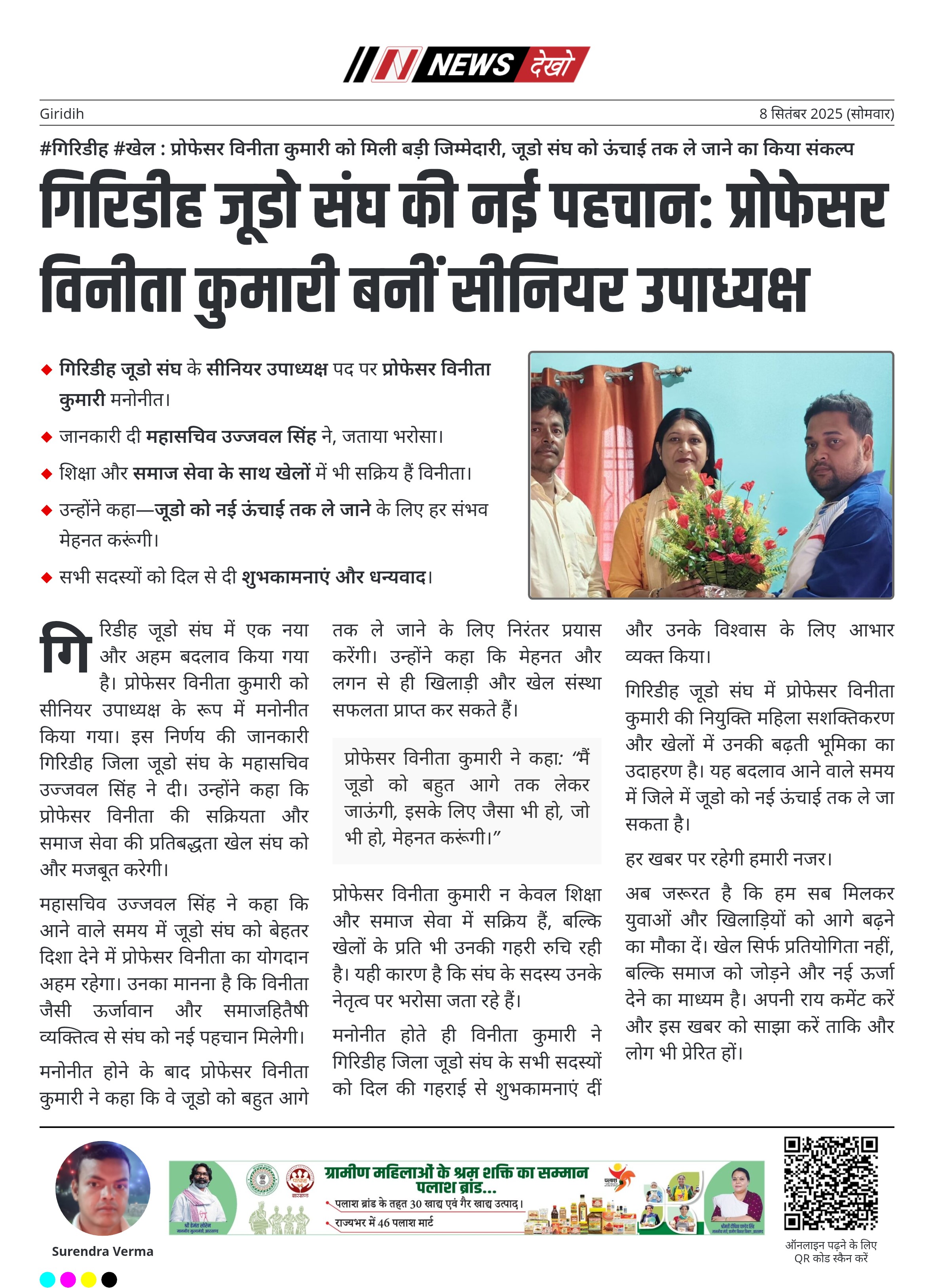 गिरिडीह जूडो संघ में प्रोफेसर विनीता कुमारी की नियुक्ति महिला सशक्तिकरण और खेलों में उनकी बढ़ती भूमिका का उदाहरण है। यह बदलाव आने वाले समय में जिले में जूडो को नई ऊंचाई तक ले जा सकता है।