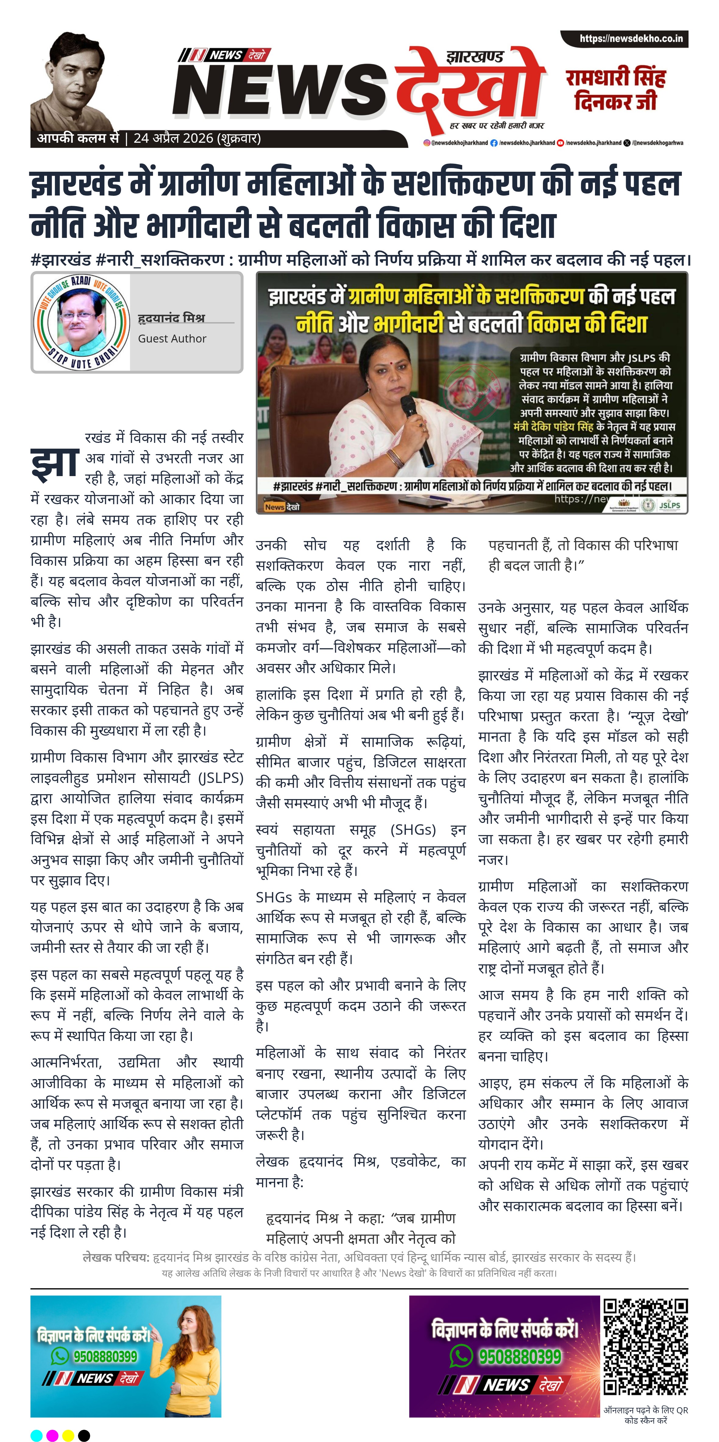 झारखंड में महिलाओं को केंद्र में रखकर किया जा रहा यह प्रयास विकास की नई परिभाषा प्रस्तुत करता है। ‘न्यूज़ देखो’ मानता है कि यदि इस मॉडल को सही दिशा और निरंतरता मिली, तो यह पूरे देश के लिए उदाहरण बन सकता है। हालांकि चुनौतियां मौजूद हैं, लेकिन मजबूत नीति और जमीनी भागीदारी से इन्हें पार किया जा सकता है। हर खबर पर रहेगी हमारी नजर।