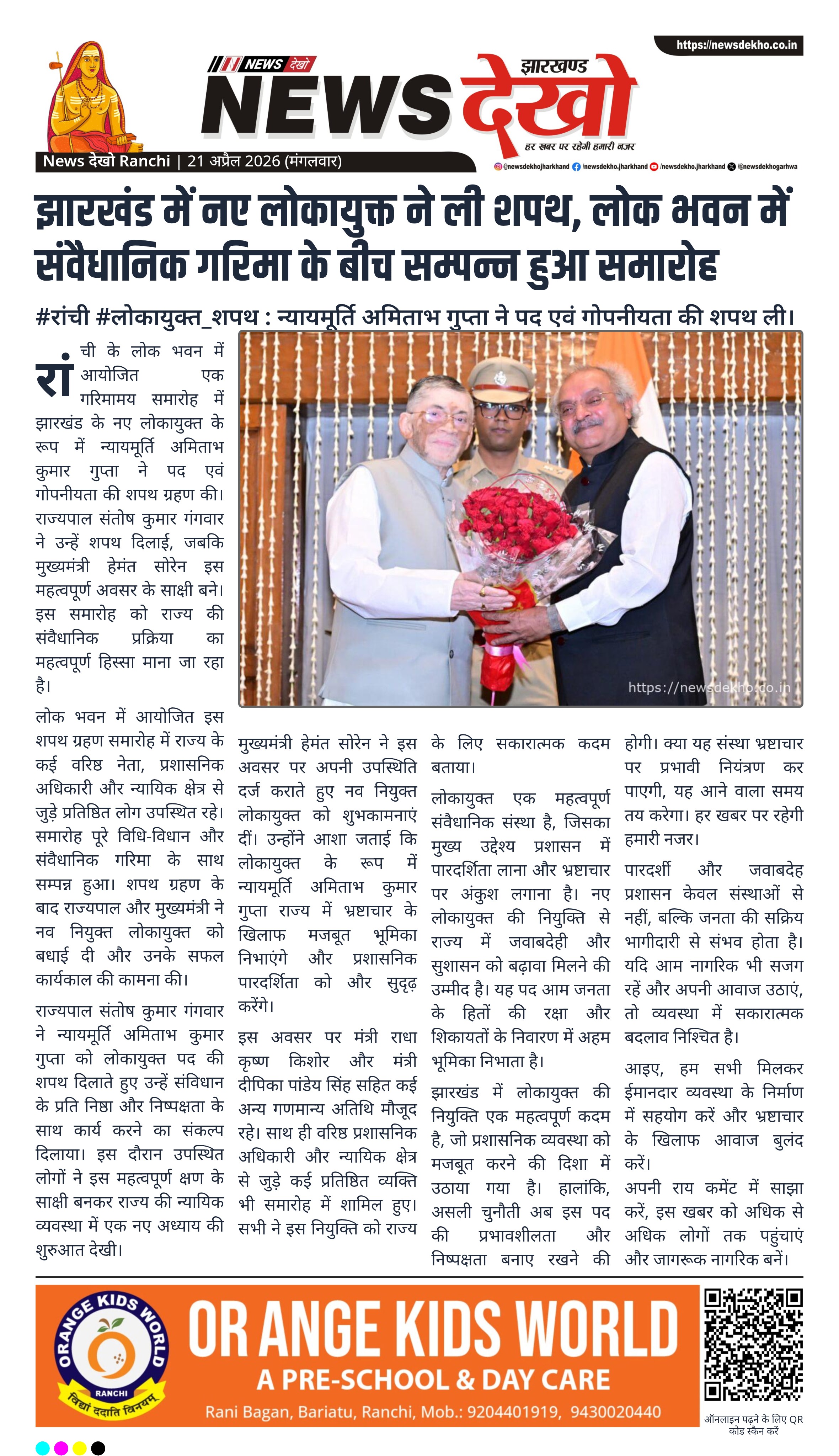 - न्यायमूर्ति अमिताभ कुमार गुप्ता ने झारखंड के नए लोकायुक्त के रूप में शपथ ली।