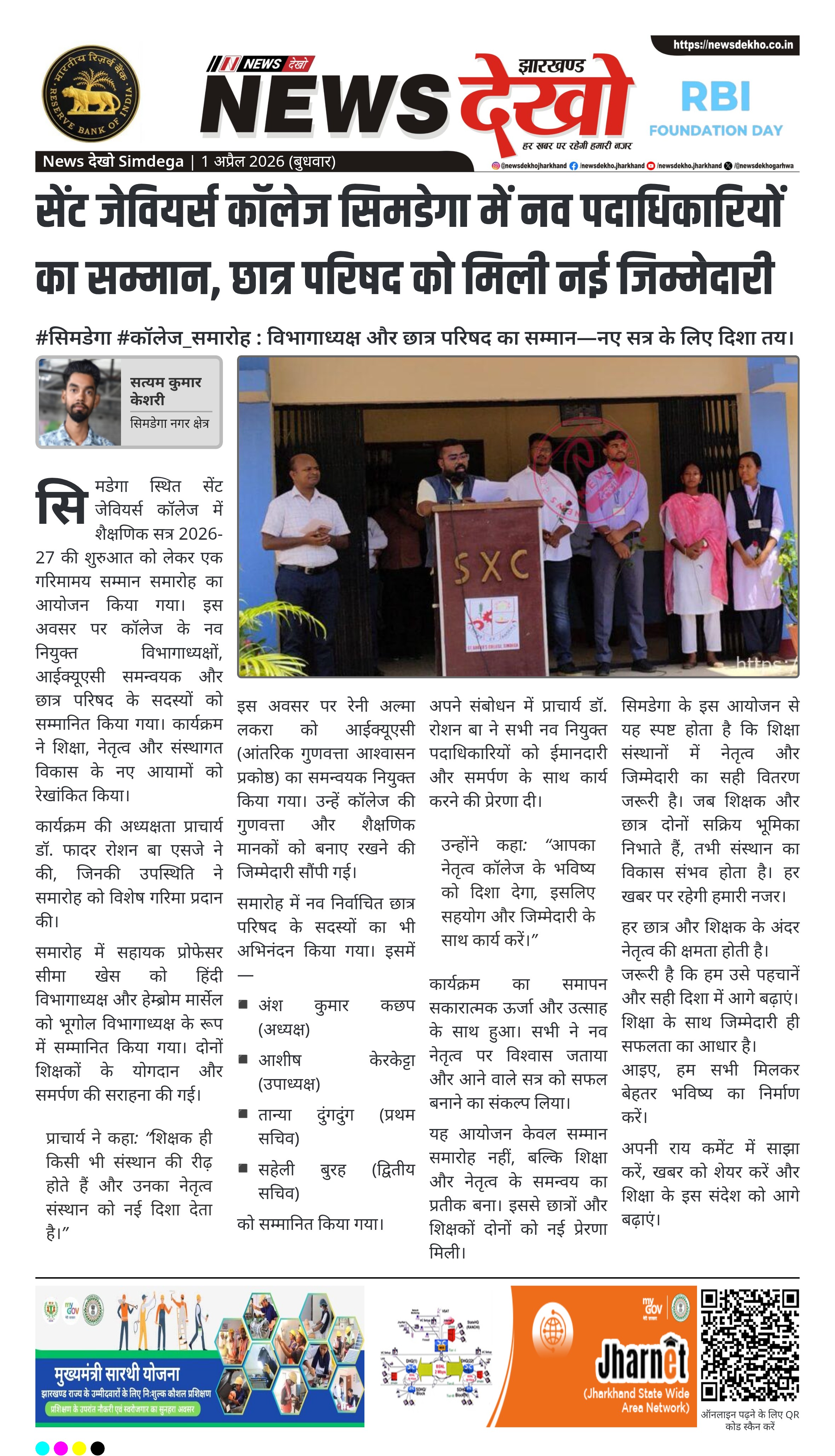 • सेंट जेवियर्स कॉलेज, सिमडेगा में सम्मान समारोह आयोजित।