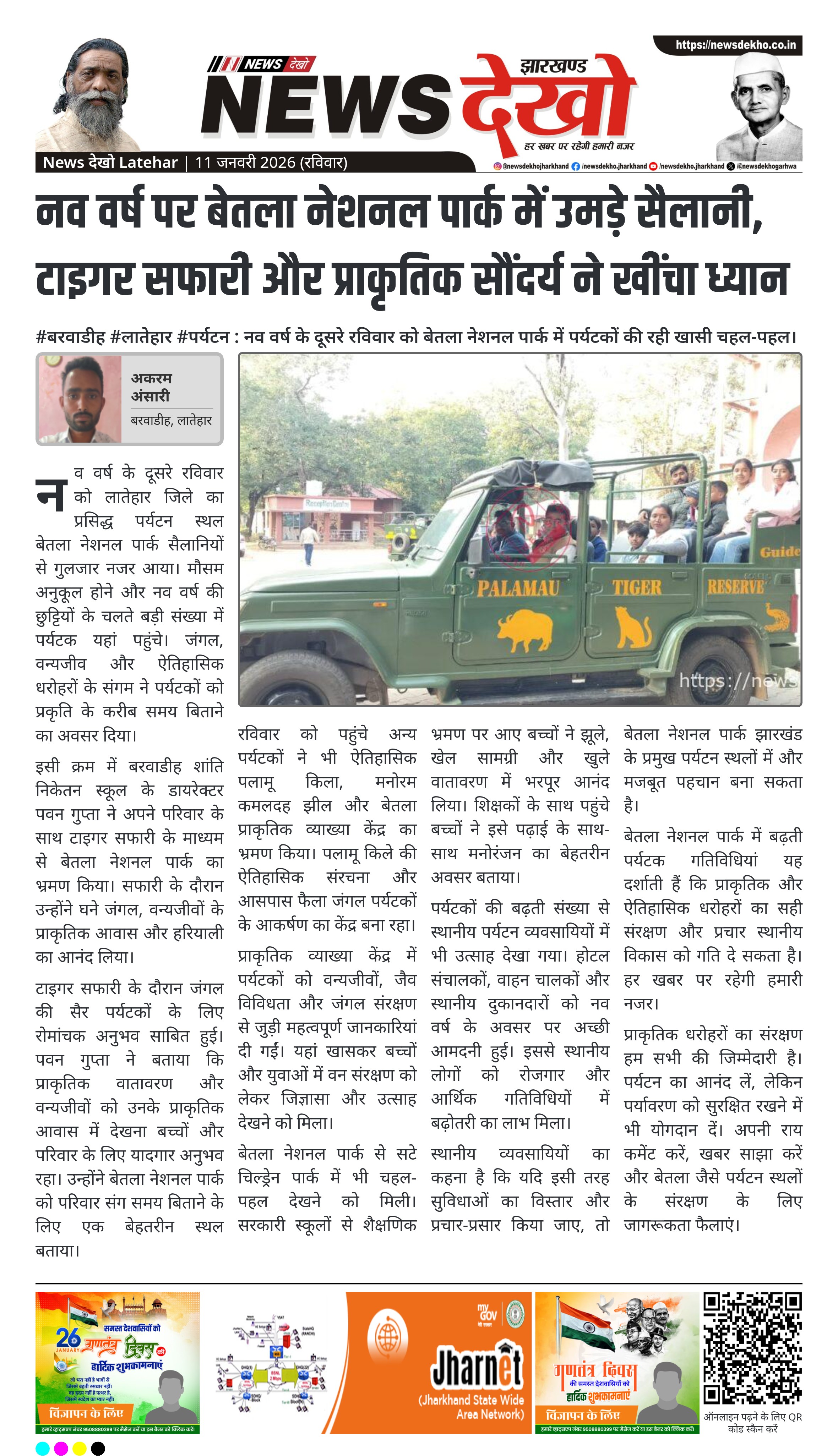 नव वर्ष के दूसरे रविवार को लातेहार जिले के बेतला नेशनल पार्क में पर्यटकों की भारी भीड़ देखी गई। टाइगर सफारी, ऐतिहासिक पलामू किला और कमलदह झील जैसे प्रमुख आकर्षणों ने सैलानियों को खासा लुभाया। परिवारों, बच्चों और शिक्षण भ्रमण पर आए विद्यार्थियों की सक्रिय मौजूदगी से पार्क में रौनक बनी रही। बढ़ती पर्यटक संख्या से स्थानीय पर्यटन व्यवसाय को भी प्रत्यक्ष लाभ मिला।