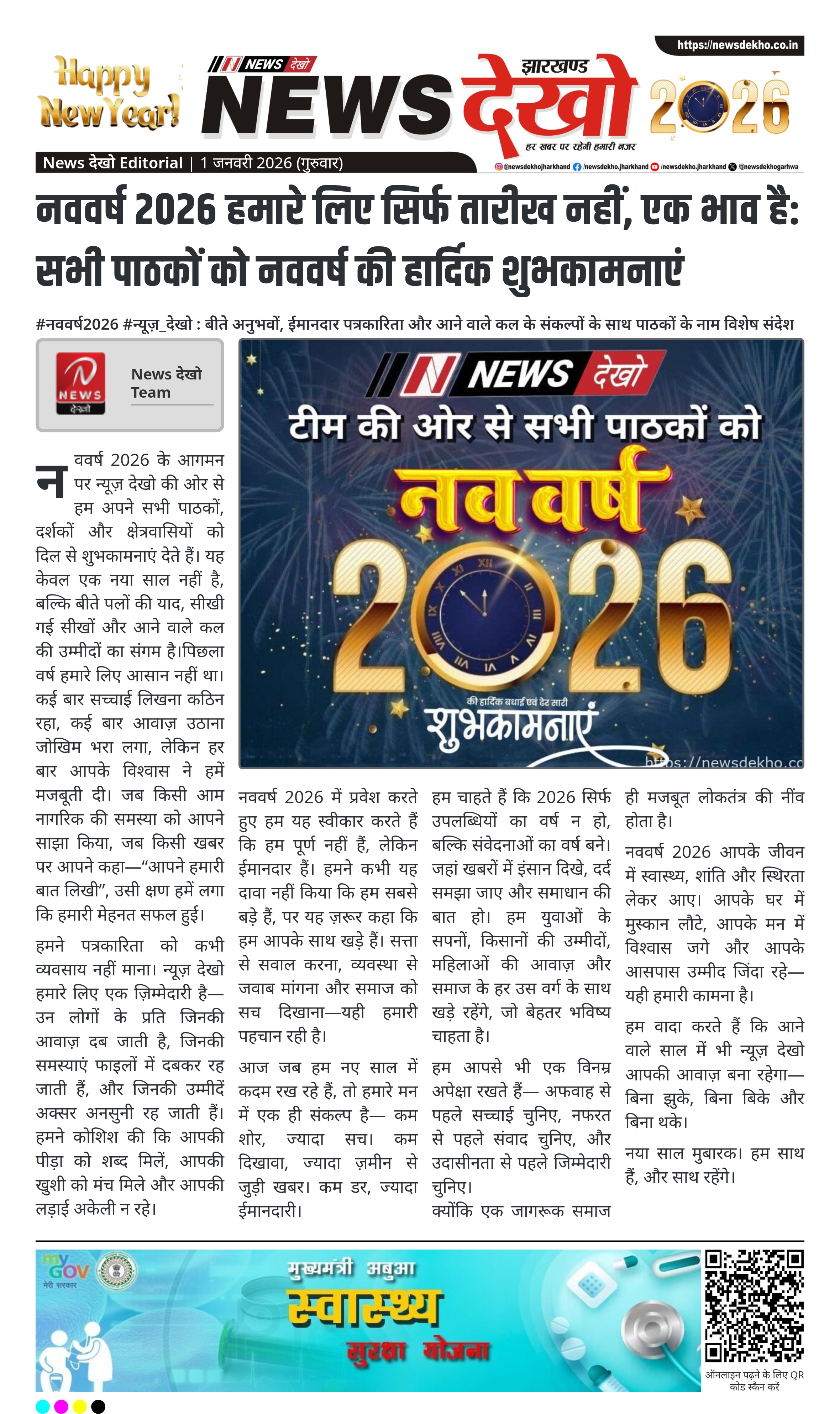 - नववर्ष 2026 के आगमन पर न्यूज़ देखो की ओर से पाठकों, दर्शकों और क्षेत्रवासियों को शुभकामनाएं।