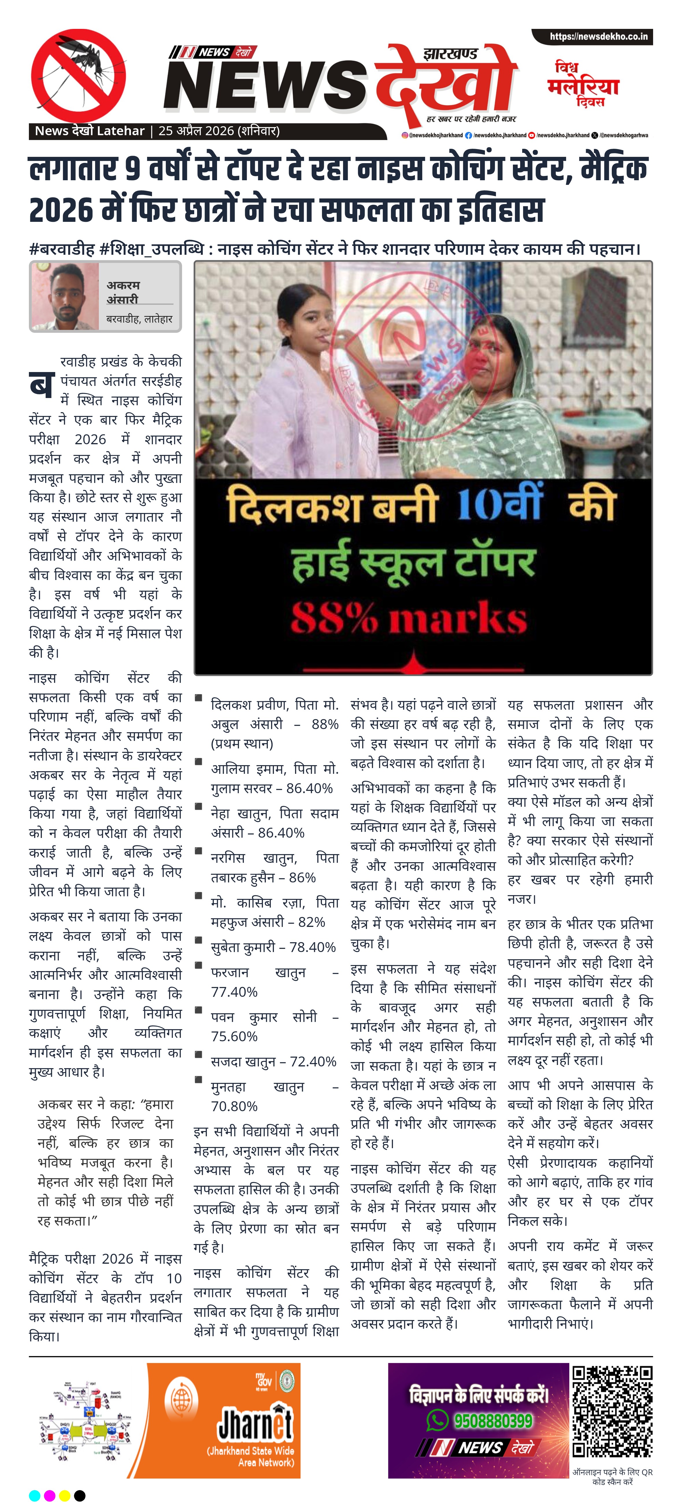 - नाइस कोचिंग सेंटर, सरईडीह ने लगातार 9वें वर्ष टॉपर देने का रिकॉर्ड कायम रखा।