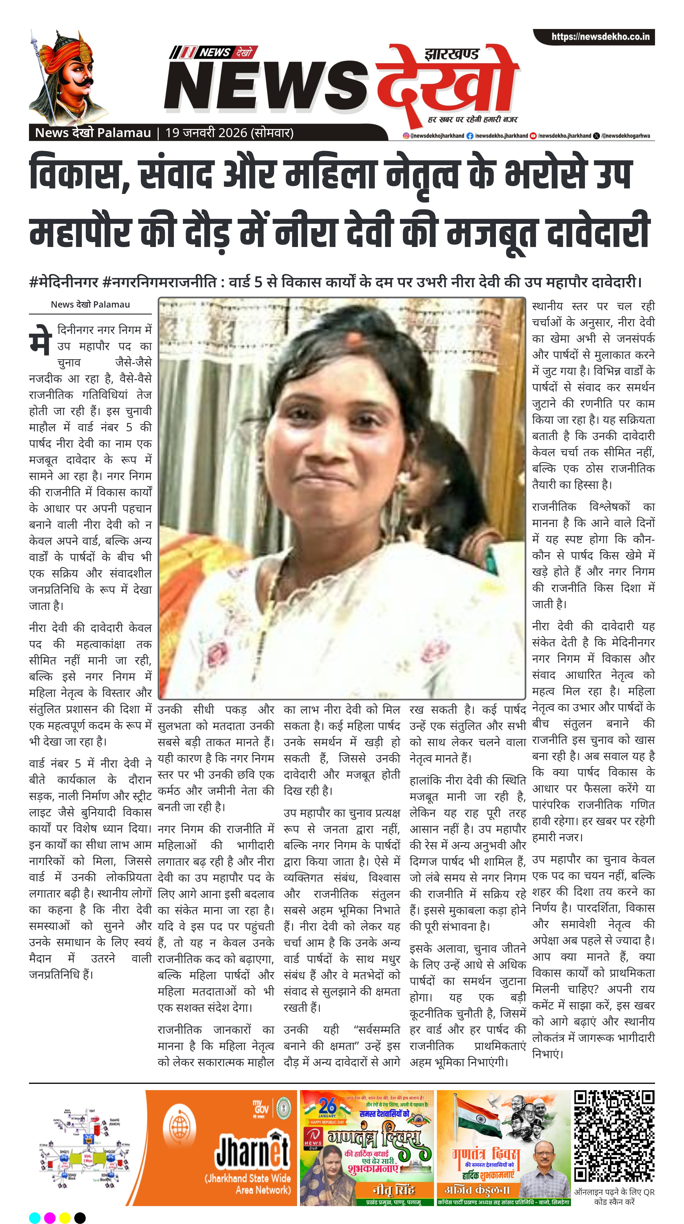 मेदिनीनगर नगर निगम में उप महापौर पद को लेकर राजनीतिक हलचल तेज हो गई है और इस दौड़ में वार्ड नंबर 5 की पार्षद नीरा देवी का नाम प्रमुखता से उभर रहा है। विकास कार्यों, जनसुलभ छवि और महिला नेतृत्व के प्रतीक के रूप में उनकी दावेदारी को गंभीरता से देखा जा रहा है। स्थानीय राजनीतिक समीकरणों और पार्षदों के आपसी तालमेल में उनकी भूमिका अहम मानी जा रही है। आगामी चुनाव को लेकर नीरा देवी का खेमा सक्रिय जनसंपर्क में जुटा हुआ है, जिससे मुकाबला और रोचक होता दिख रहा है।