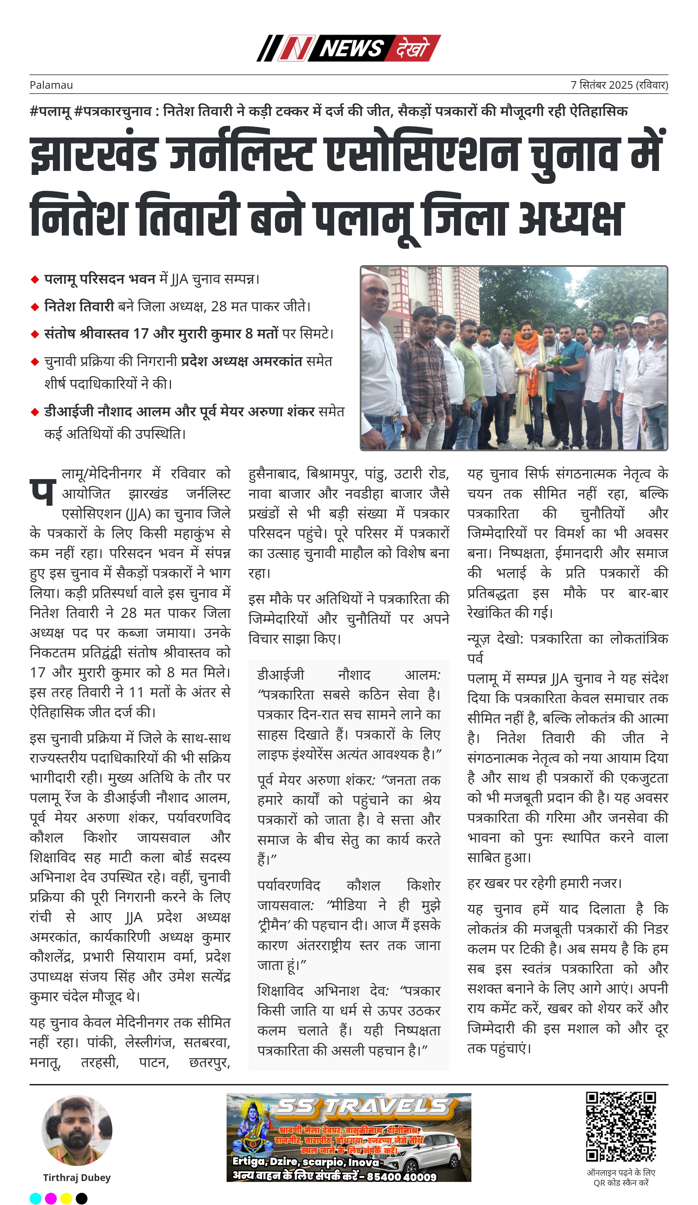 पलामू/मेदिनीनगर में रविवार को आयोजित झारखंड जर्नलिस्ट एसोसिएशन (JJA) का चुनाव जिले के पत्रकारों के लिए किसी महाकुंभ से कम नहीं रहा। परिसदन भवन में संपन्न हुए इस चुनाव में सैकड़ों पत्रकारों ने भाग लिया। कड़ी प्रतिस्पर्धा वाले इस चुनाव में नितेश तिवारी ने 28 मत पाकर जिला अध्यक्ष पद पर कब्जा जमाया। उनके निकटतम प्रतिद्वंद्वी संतोष श्रीवास्तव को 17 और मुरारी कुमार को 8 मत मिले। इस तरह तिवारी ने 11 मतों के अंतर से ऐतिहासिक जीत दर्ज की।