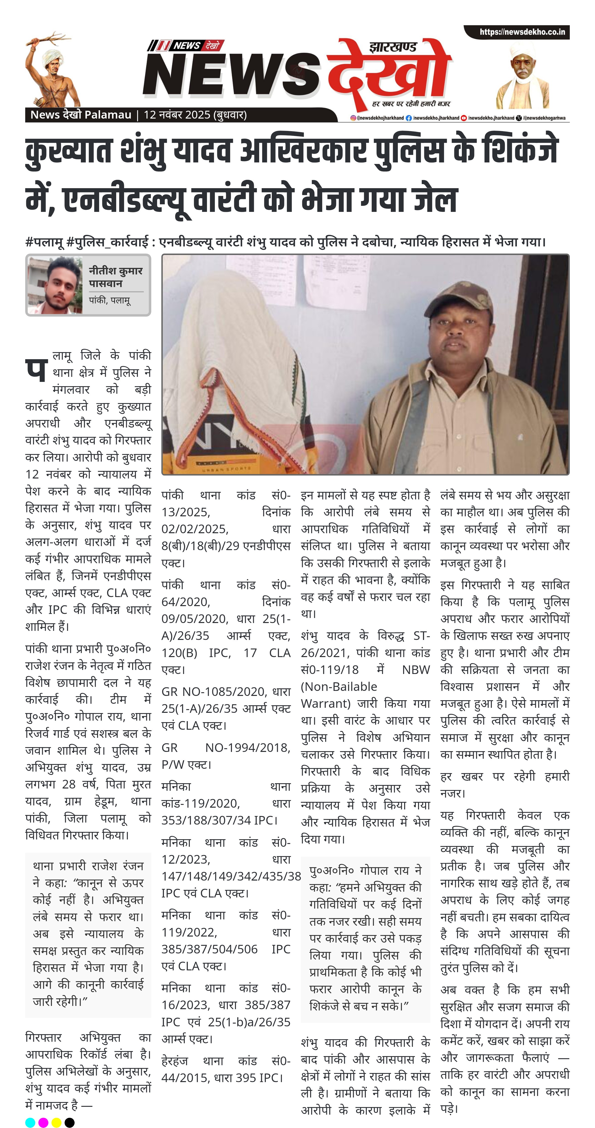 पलामू जिले के पांकी थाना क्षेत्र में पुलिस ने मंगलवार को बड़ी कार्रवाई करते हुए कुख्यात अपराधी और एनबीडब्ल्यू वारंटी शंभु यादव को गिरफ्तार कर लिया। आरोपी को बुधवार 12 नवंबर को न्यायालय में पेश करने के बाद न्यायिक हिरासत में भेजा गया। पुलिस के अनुसार, शंभु यादव पर अलग-अलग धाराओं में दर्ज कई गंभीर आपराधिक मामले लंबित हैं, जिनमें एनडीपीएस एक्ट, आर्म्स एक्ट, CLA एक्ट और IPC की विभिन्न धाराएं शामिल हैं।