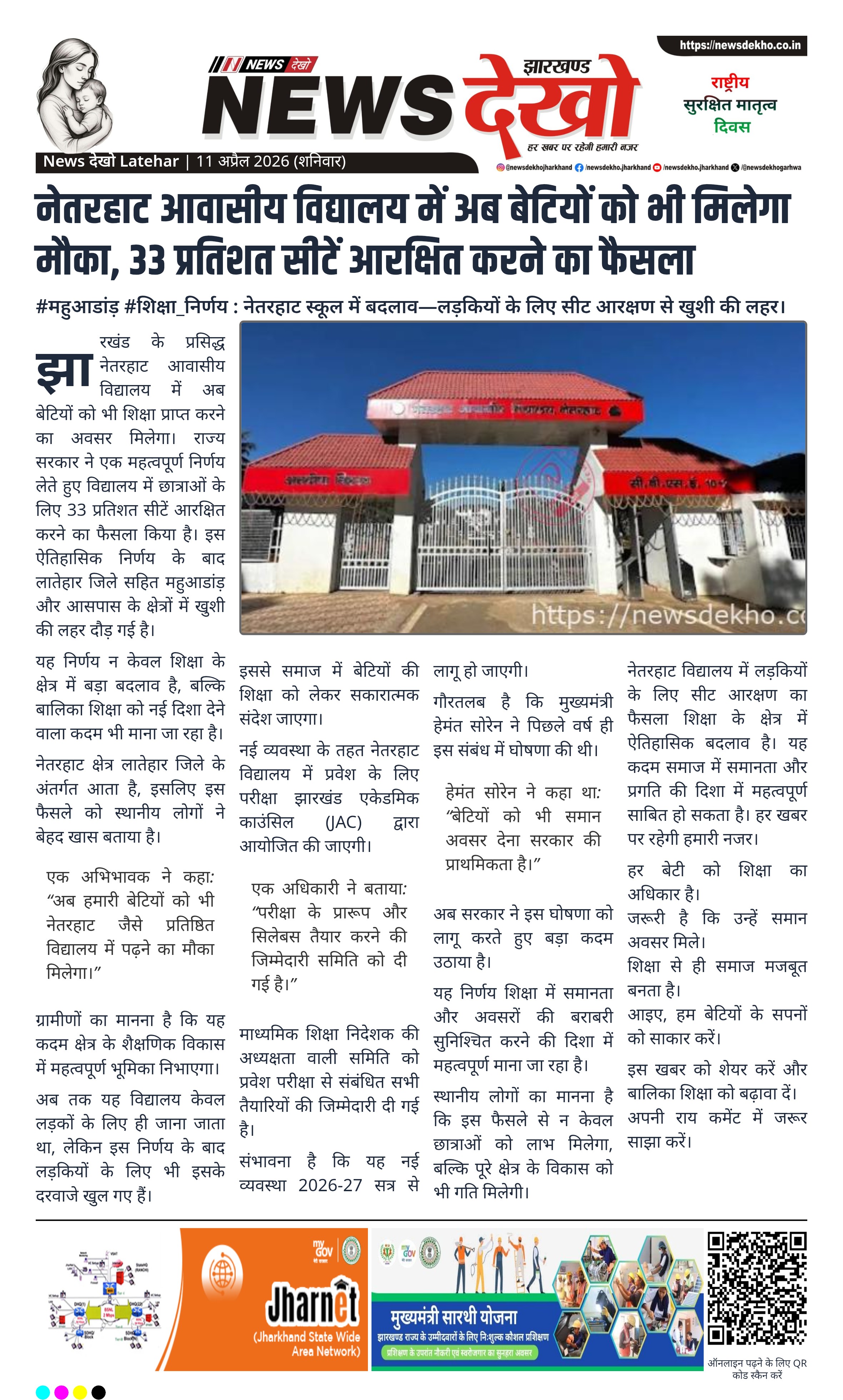 झारखंड सरकार ने नेतरहाट आवासीय विद्यालय में लड़कियों के लिए 33 प्रतिशत सीटें आरक्षित करने का निर्णय लिया है। इस फैसले से लातेहार सहित पूरे क्षेत्र में खुशी है। अब छात्राओं को भी प्रतिष्ठित विद्यालय में पढ़ने का अवसर मिलेगा। 2026-27 सत्र से नई व्यवस्था लागू होने की संभावना है।