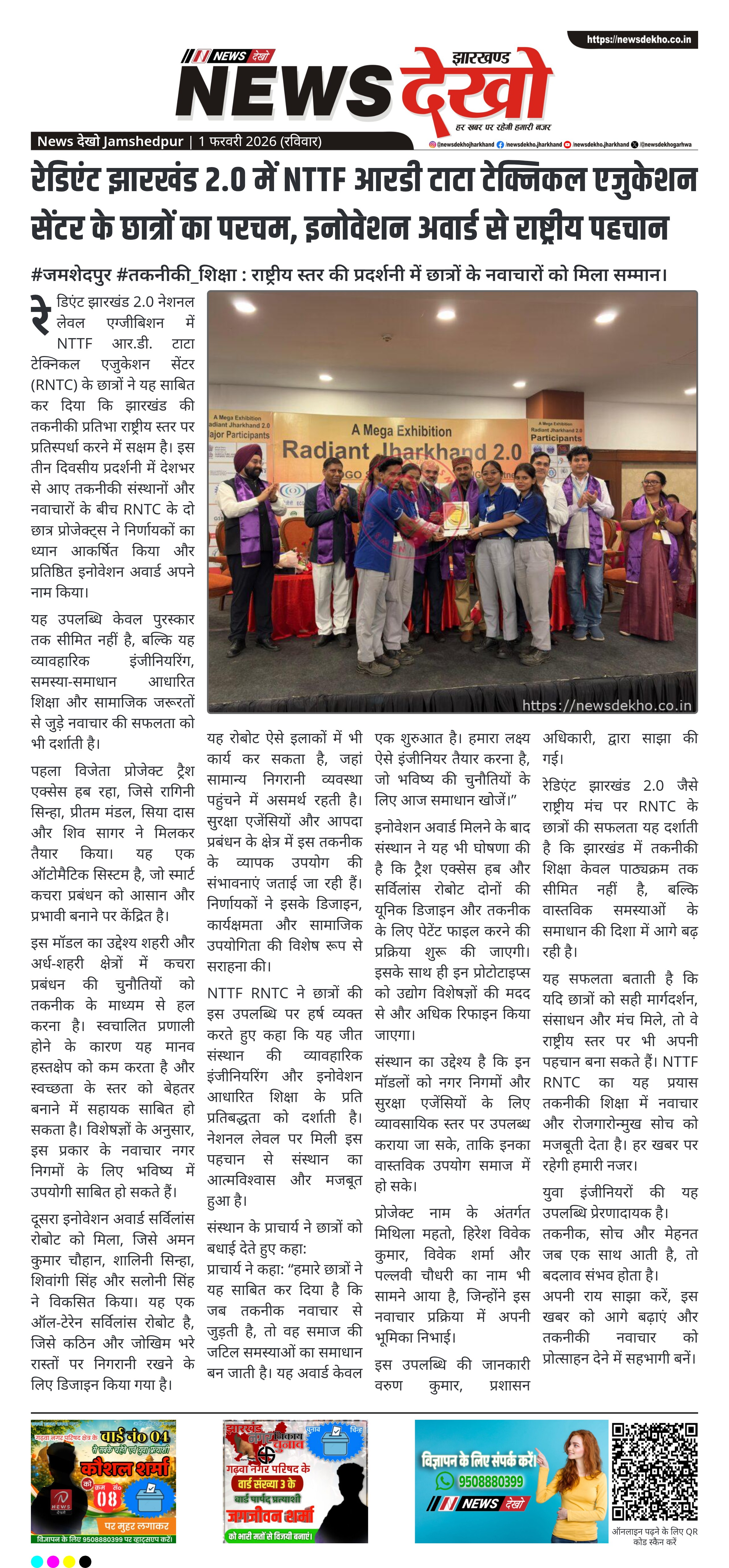 रेडिएंट झारखंड 2.0 नेशनल लेवल एग्जीबिशन में NTTF आर.डी. टाटा टेक्निकल एजुकेशन सेंटर (RNTC) के छात्रों ने यह साबित कर दिया कि झारखंड की तकनीकी प्रतिभा राष्ट्रीय स्तर पर प्रतिस्पर्धा करने में सक्षम है। इस तीन दिवसीय प्रदर्शनी में देशभर से आए तकनीकी संस्थानों और नवाचारों के बीच RNTC के दो छात्र प्रोजेक्ट्स ने निर्णायकों का ध्यान आकर्षित किया और प्रतिष्ठित इनोवेशन अवार्ड अपने नाम किया।