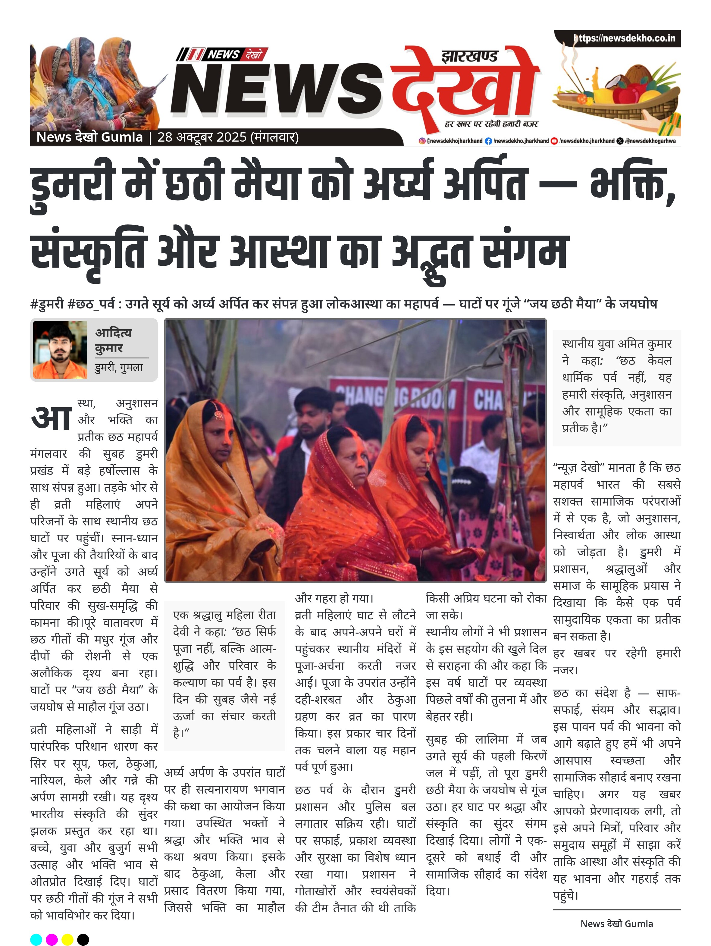 “न्यूज़ देखो” मानता है कि छठ महापर्व भारत की सबसे सशक्त सामाजिक परंपराओं में से एक है, जो अनुशासन, निस्वार्थता और लोक आस्था को जोड़ता है। डुमरी में प्रशासन, श्रद्धालुओं और समाज के सामूहिक प्रयास ने दिखाया कि कैसे एक पर्व सामुदायिक एकता का प्रतीक बन सकता है।