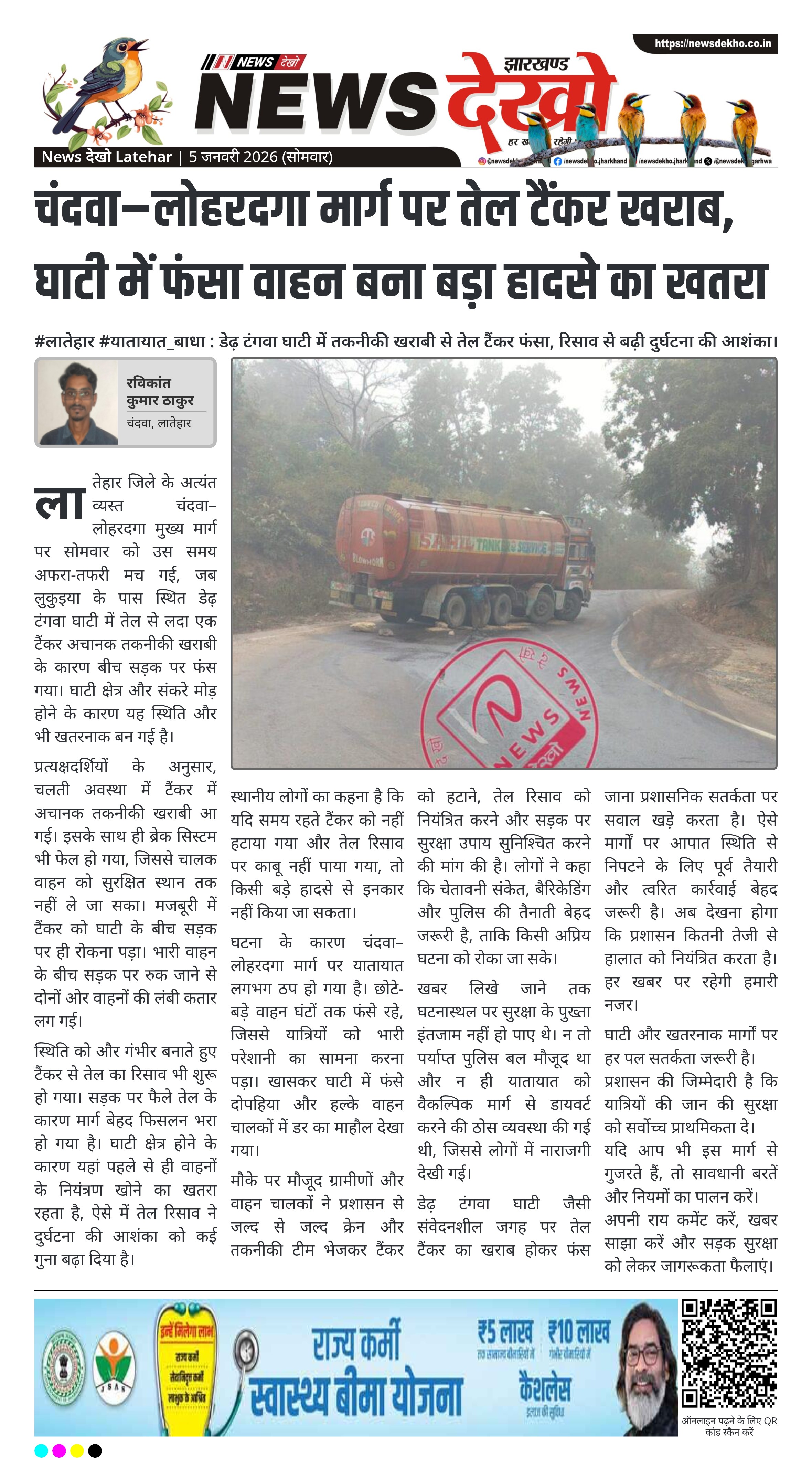 - चंदवा–लोहरदगा मुख्य मार्ग पर डेढ़ टंगवा घाटी में तेल टैंकर खराब।