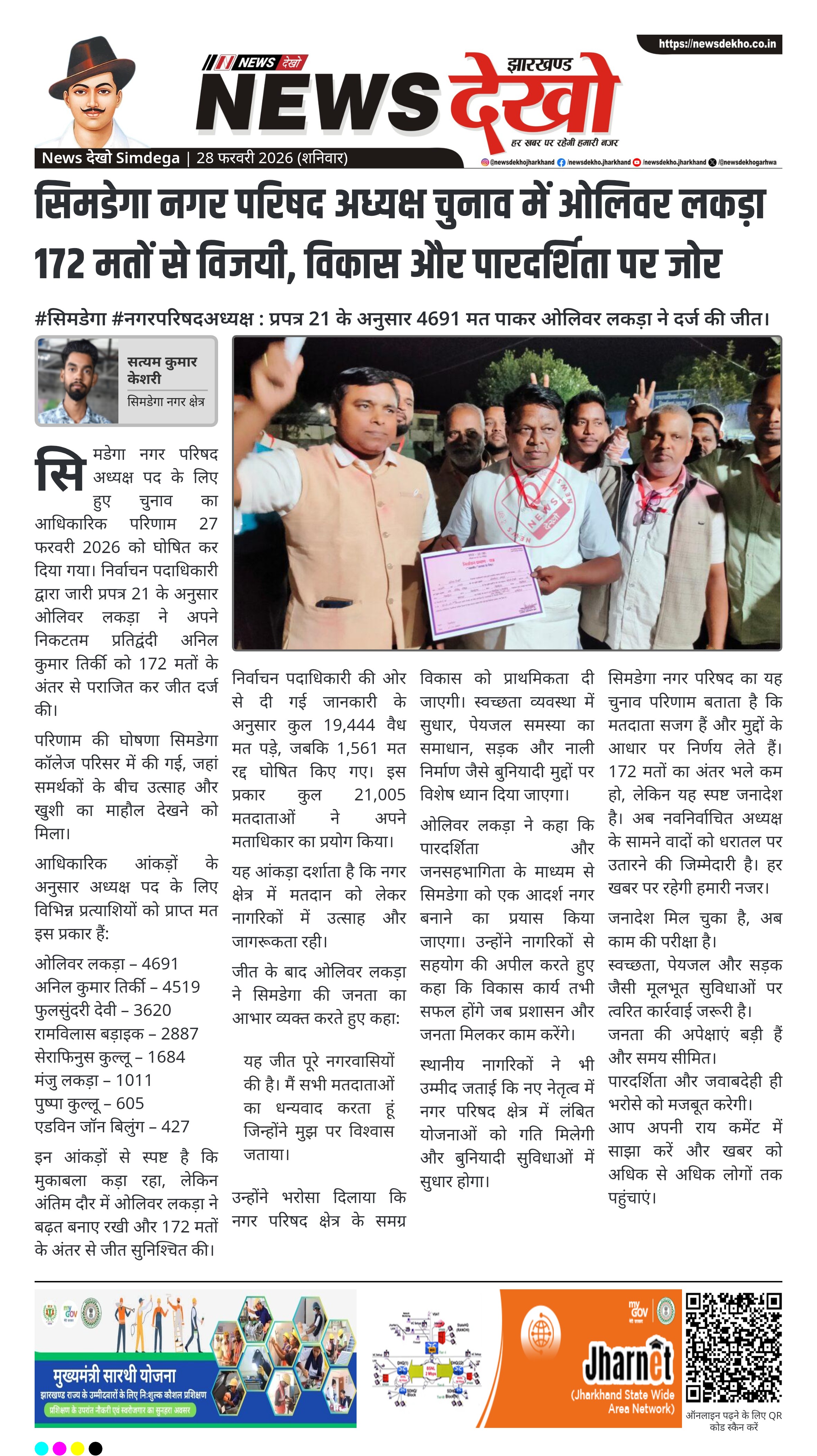 सिमडेगा नगर परिषद अध्यक्ष पद के लिए हुए चुनाव का आधिकारिक परिणाम 27 फरवरी 2026 को घोषित कर दिया गया। निर्वाचन पदाधिकारी द्वारा जारी प्रपत्र 21 के अनुसार ओलिवर लकड़ा ने अपने निकटतम प्रतिद्वंदी अनिल कुमार तिर्की को 172 मतों के अंतर से पराजित कर जीत दर्ज की।