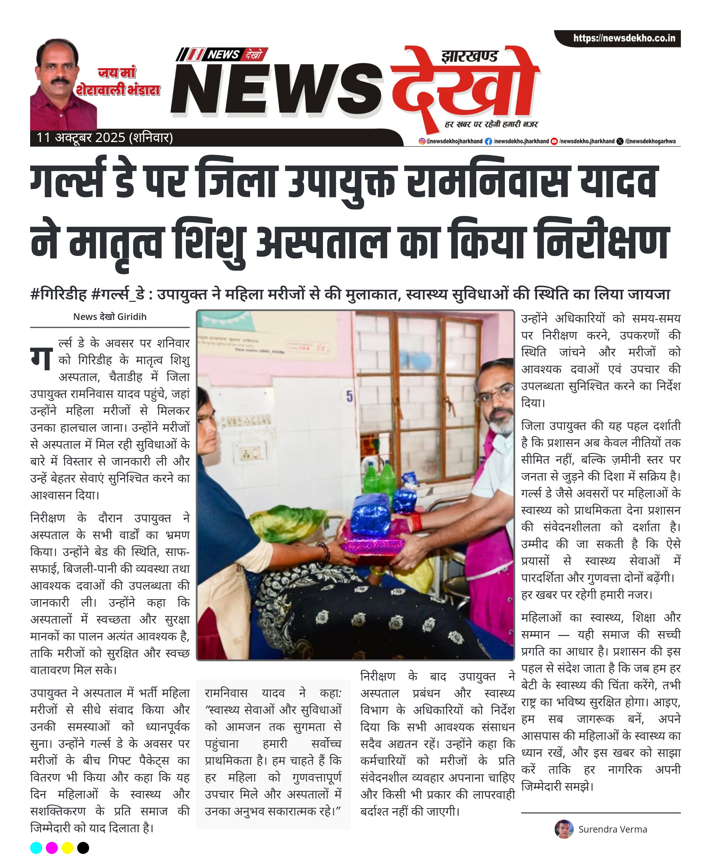 - जिला उपायुक्त रामनिवास यादव ने गर्ल्स डे के अवसर पर मातृत्व शिशु अस्पताल, चैताडीह का निरीक्षण किया।