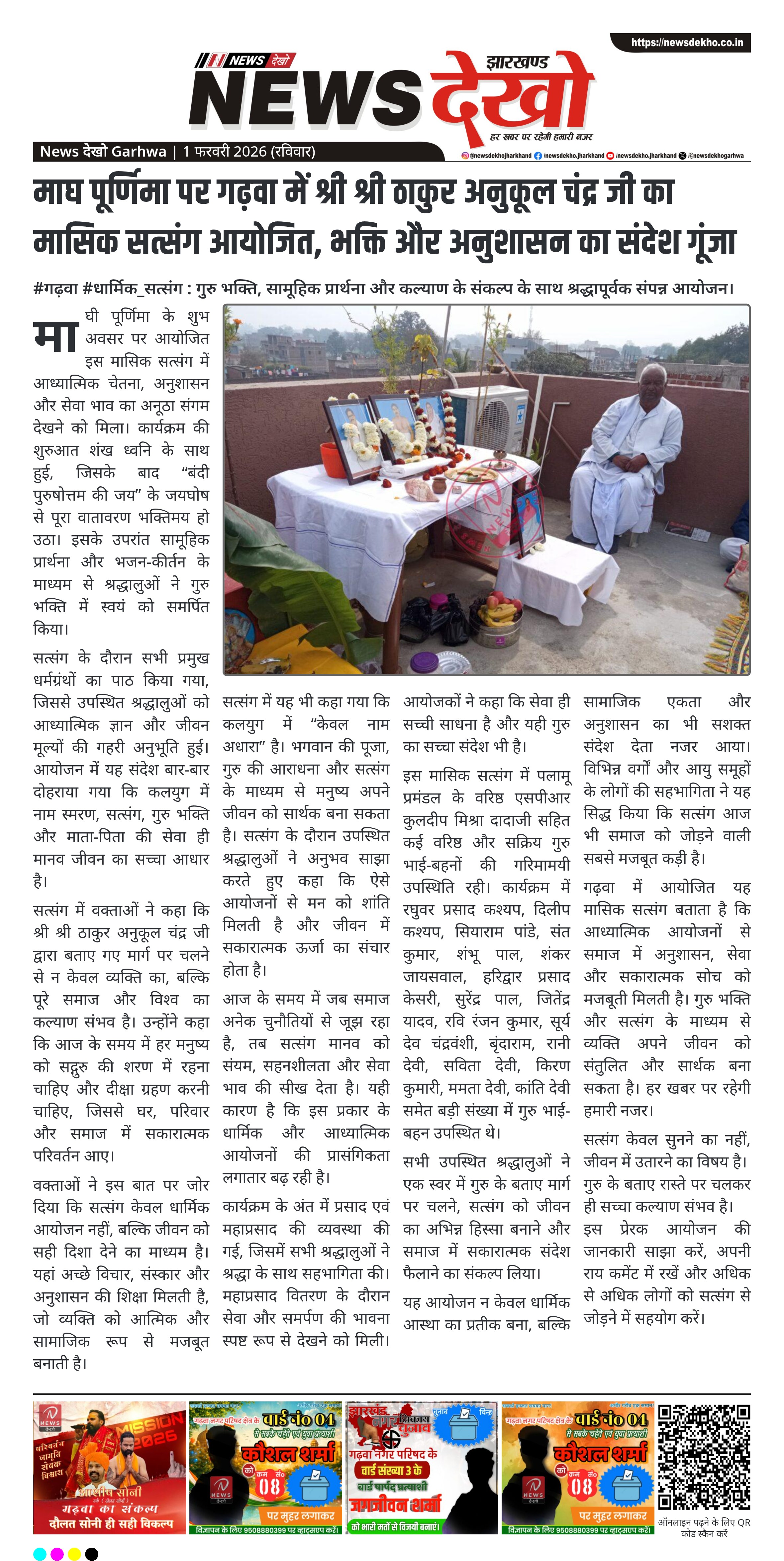 गढ़वा जिले के भागलपुर टंडवा में माघी पूर्णिमा के पावन अवसर पर परम दयाल युग पुरुषोत्तम श्री श्री ठाकुर अनुकूल चंद्र जी का मासिक सत्संग श्रद्धा और अनुशासन के साथ आयोजित किया गया। गुरु भाई संत कुमार जी के निवास पर हुए इस आयोजन में सामूहिक प्रार्थना, भजन-कीर्तन और धर्मग्रंथ पाठ के माध्यम से आध्यात्मिक वातावरण निर्मित हुआ। सत्संग में गुरु के बताए मार्ग पर चलने और समाज व विश्व कल्याण का संकल्प लिया गया। बड़ी संख्या में गुरु भाई-बहनों की सहभागिता ने आयोजन को विशेष बना दिया।