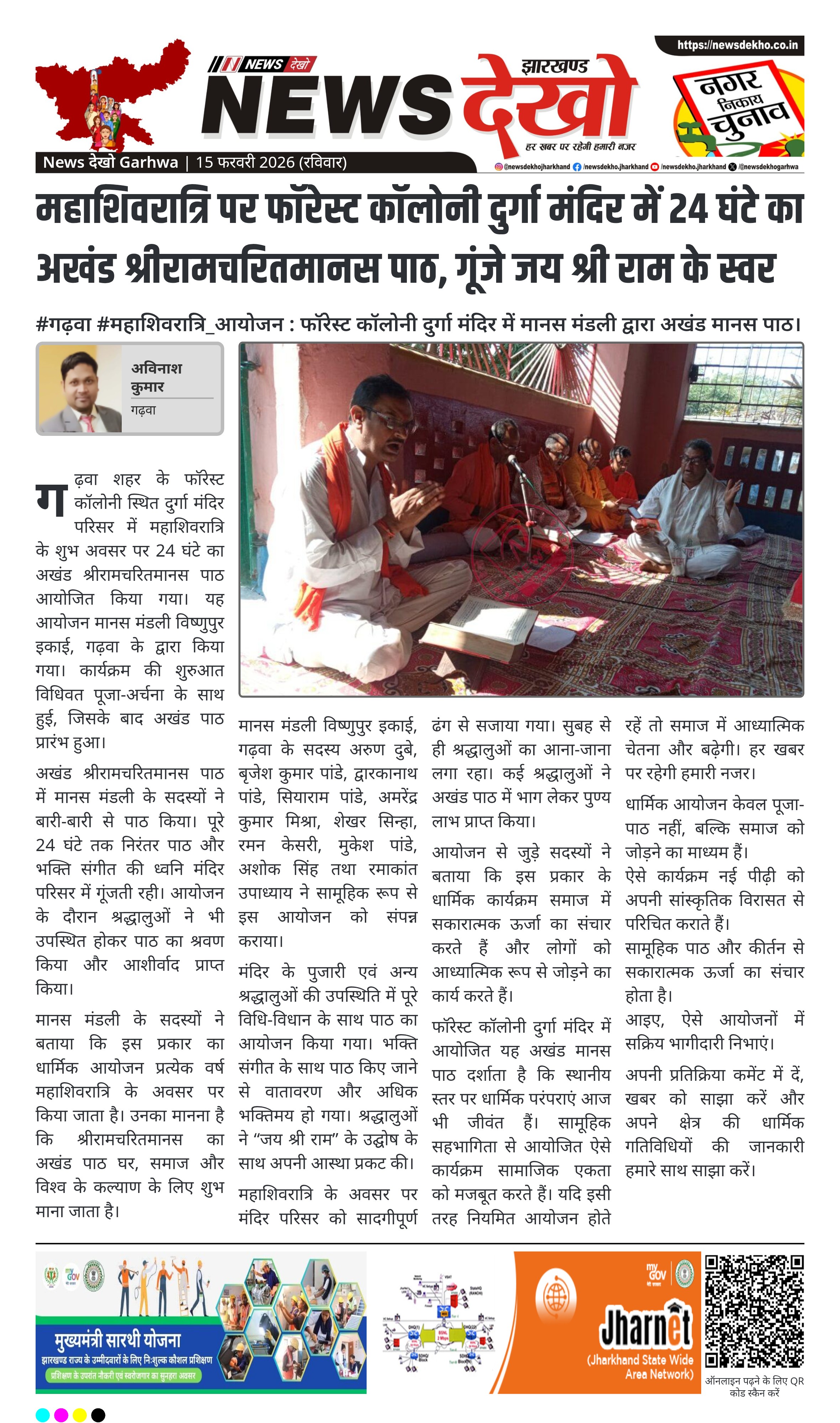 गढ़वा के फॉरेस्ट कॉलोनी स्थित दुर्गा मंदिर परिसर में महाशिवरात्रि के अवसर पर 24 घंटे का अखंड श्रीरामचरितमानस पाठ आयोजित किया गया। मानस मंडली विष्णुपुर इकाई, गढ़वा के सदस्यों ने सामूहिक रूप से पाठ का संचालन किया। कार्यक्रम में मंदिर पुजारी एवं स्थानीय श्रद्धालु उपस्थित रहे। धार्मिक वातावरण में भक्ति संगीत के साथ आयोजन संपन्न हुआ।