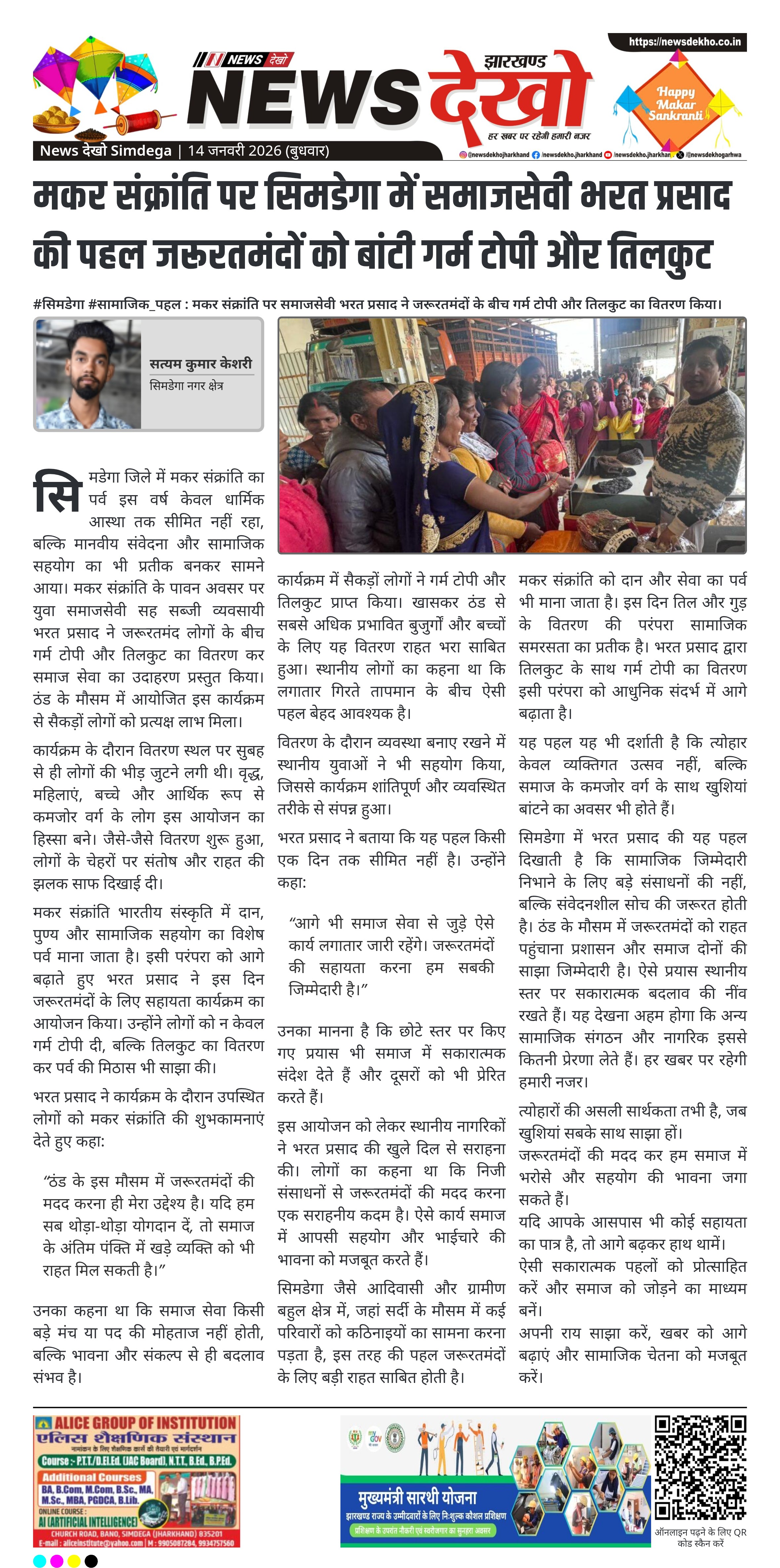 - सिमडेगा में मकर संक्रांति के अवसर पर जरूरतमंदों को राहत सामग्री वितरण।