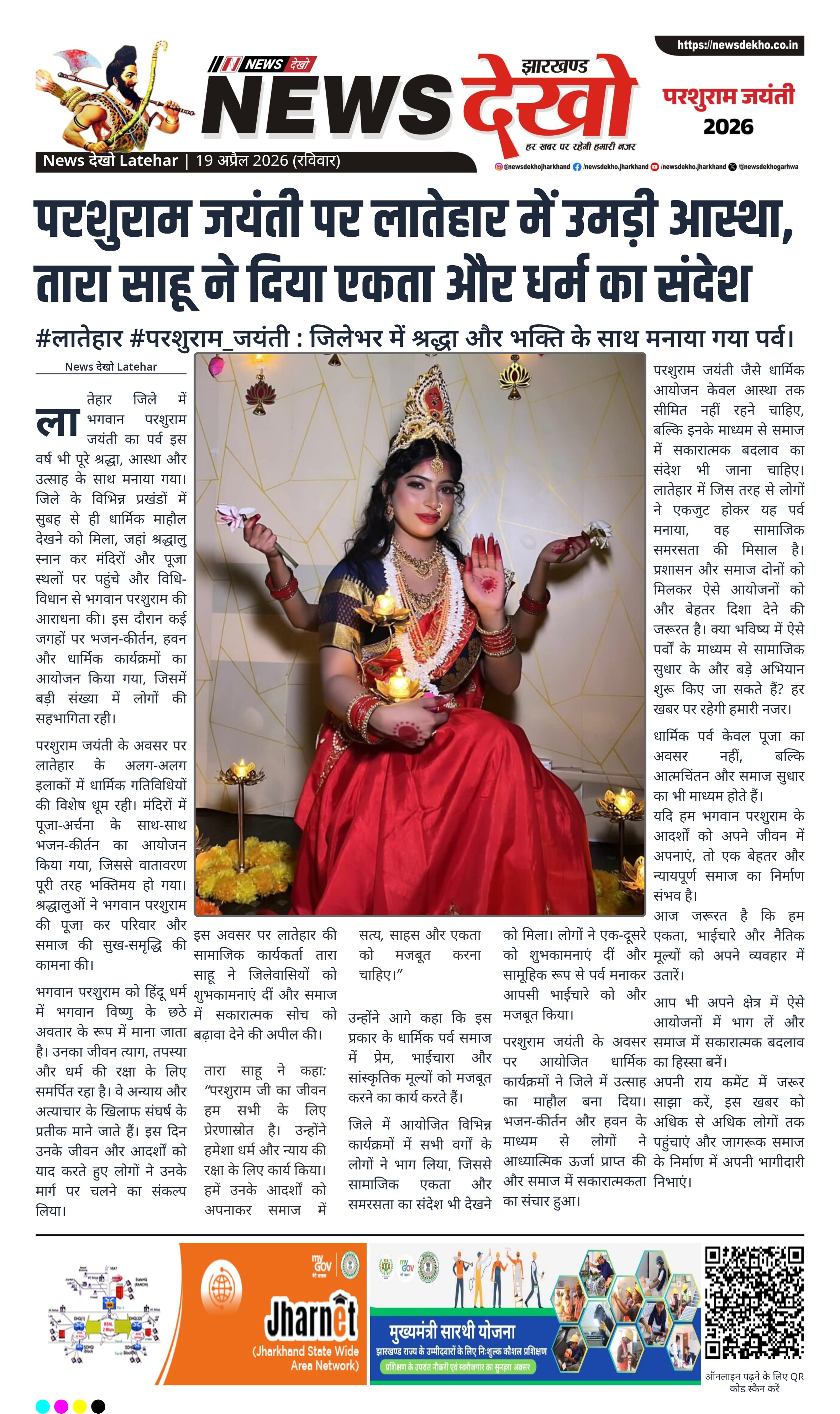 लातेहार जिले में भगवान परशुराम जयंती को लेकर व्यापक धार्मिक आयोजन किए गए, जिनमें बड़ी संख्या में श्रद्धालु शामिल हुए। विभिन्न प्रखंडों में पूजा-अर्चना, भजन-कीर्तन और हवन का आयोजन हुआ। इस अवसर पर सामाजिक कार्यकर्ता तारा साहू ने लोगों को शुभकामनाएं देते हुए समाज में एकता और धार्मिक मूल्यों को मजबूत करने का संदेश दिया। यह आयोजन सांस्कृतिक और सामाजिक समरसता का प्रतीक बनकर सामने आया।