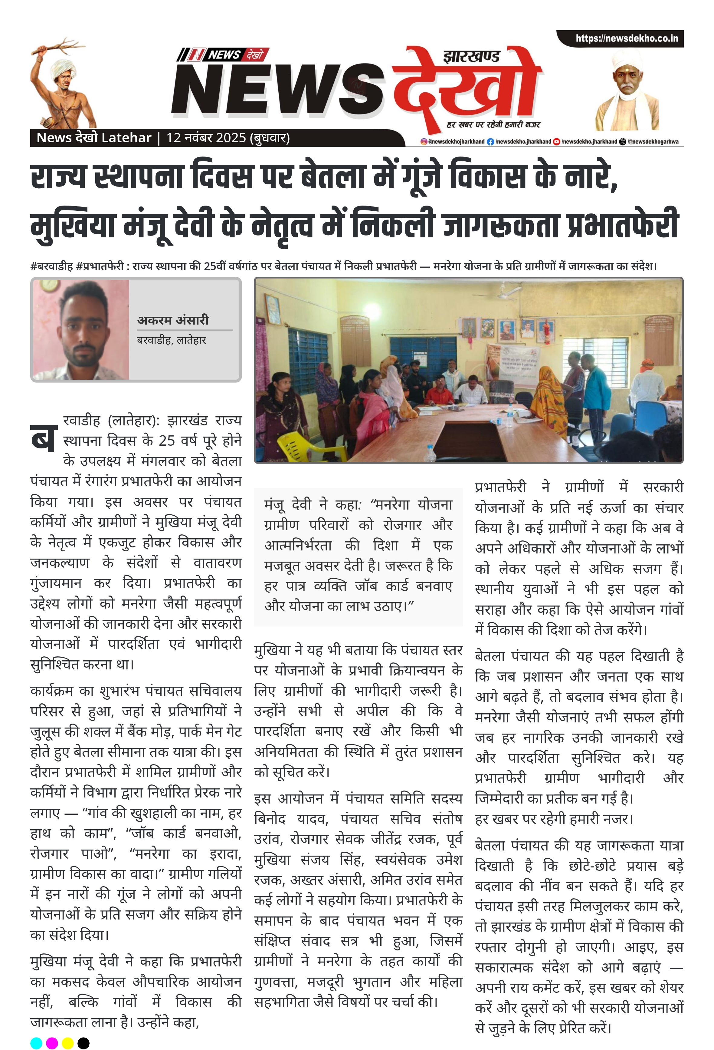 - राज्य स्थापना की 25वीं वर्षगांठ पर बेतला पंचायत में आयोजित हुआ जागरूकता प्रभातफेरी कार्यक्रम।
