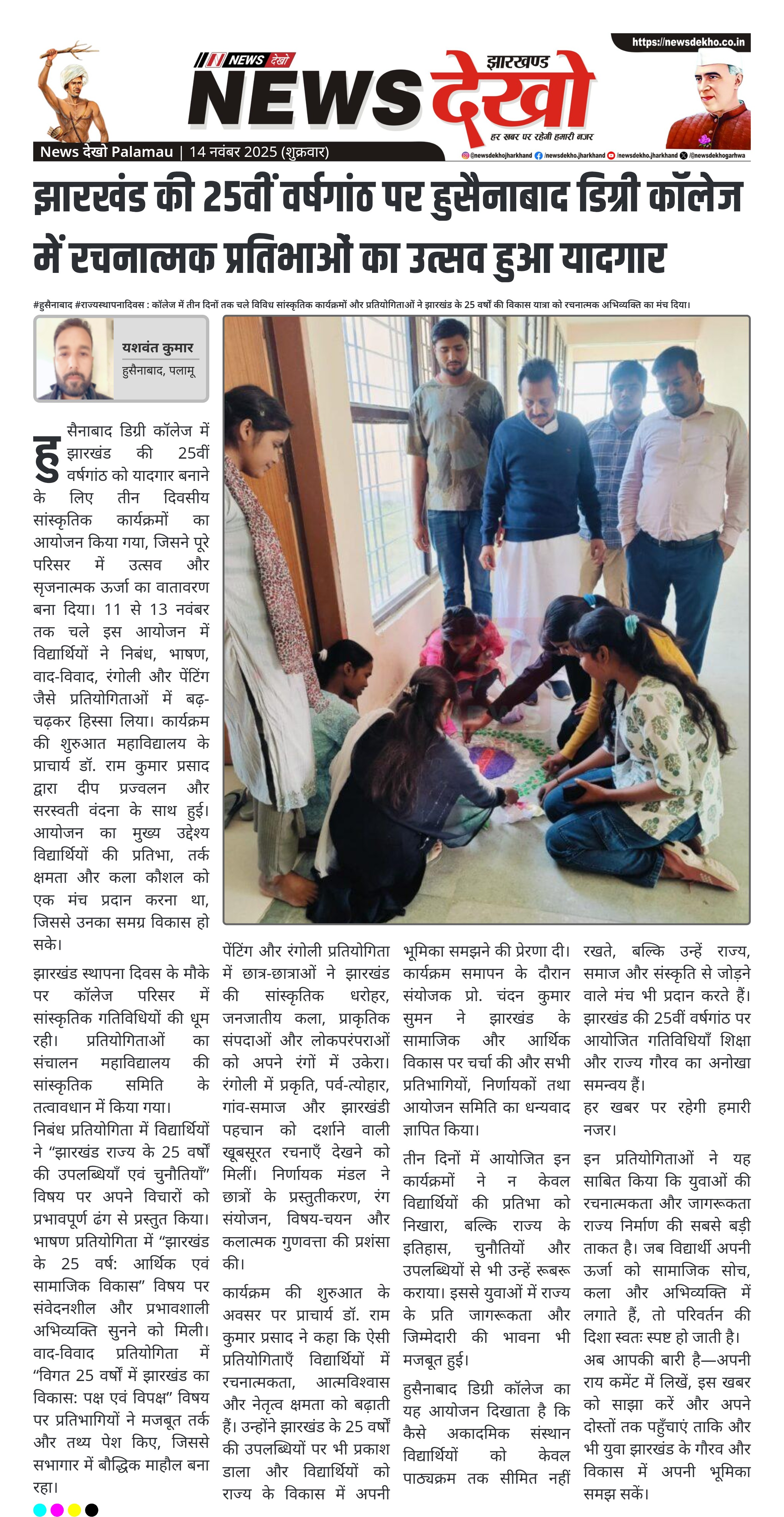 #हुसैनाबाद #राज्यस्थापनादिवस : कॉलेज में तीन दिनों तक चले विविध सांस्कृतिक कार्यक्रमों और प्रतियोगिताओं ने झारखंड के 25 वर्षों की विकास यात्रा को रचनात्मक अभिव्यक्ति का मंच दिया।
