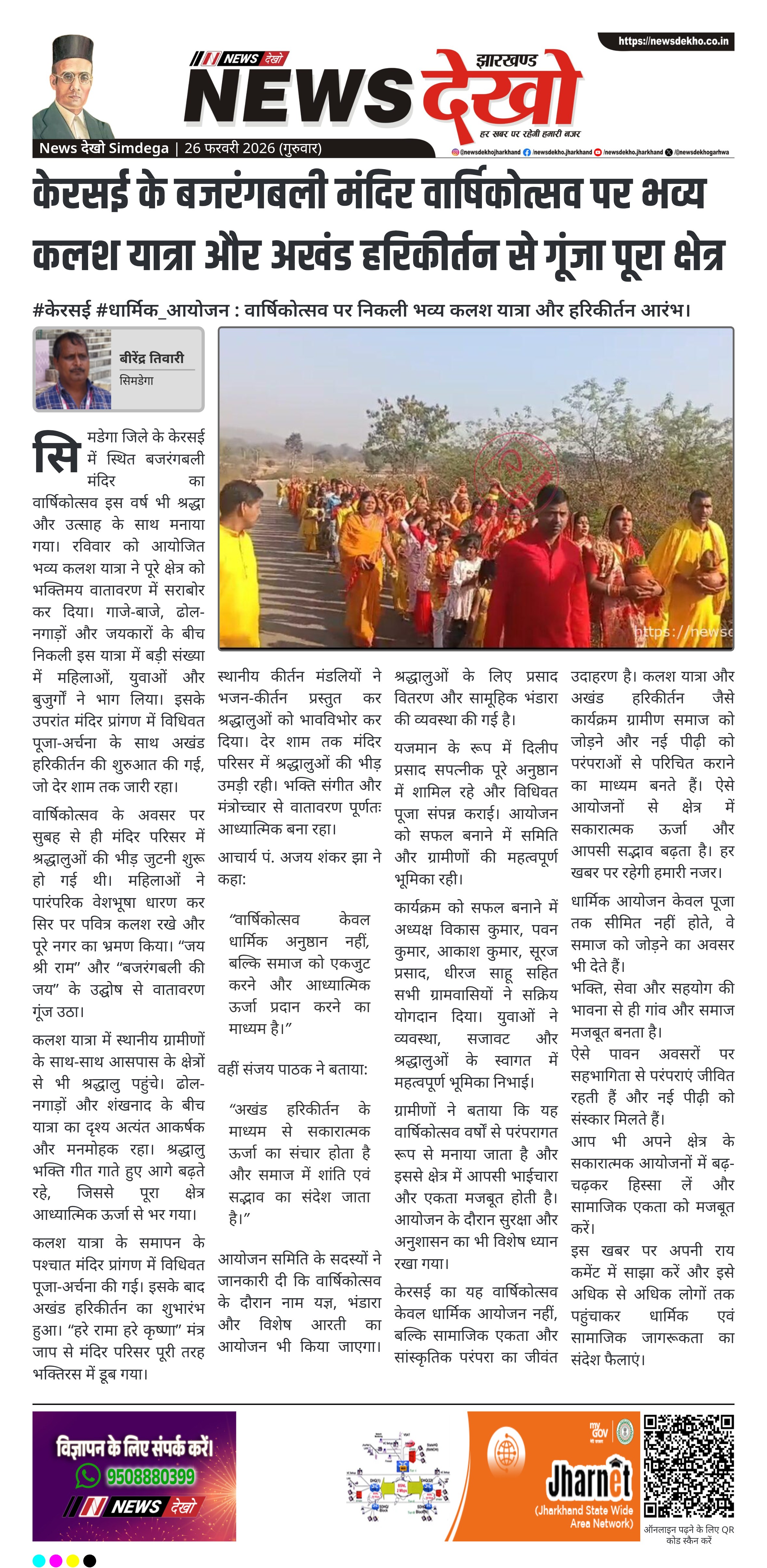 सिमडेगा जिले के केरसई में स्थित बजरंगबली मंदिर का वार्षिकोत्सव इस वर्ष भी श्रद्धा और उत्साह के साथ मनाया गया। रविवार को आयोजित भव्य कलश यात्रा ने पूरे क्षेत्र को भक्तिमय वातावरण में सराबोर कर दिया। गाजे-बाजे, ढोल-नगाड़ों और जयकारों के बीच निकली इस यात्रा में बड़ी संख्या में महिलाओं, युवाओं और बुजुर्गों ने भाग लिया। इसके उपरांत मंदिर प्रांगण में विधिवत पूजा-अर्चना के साथ अखंड हरिकीर्तन की शुरुआत की गई, जो देर शाम तक जारी रहा।