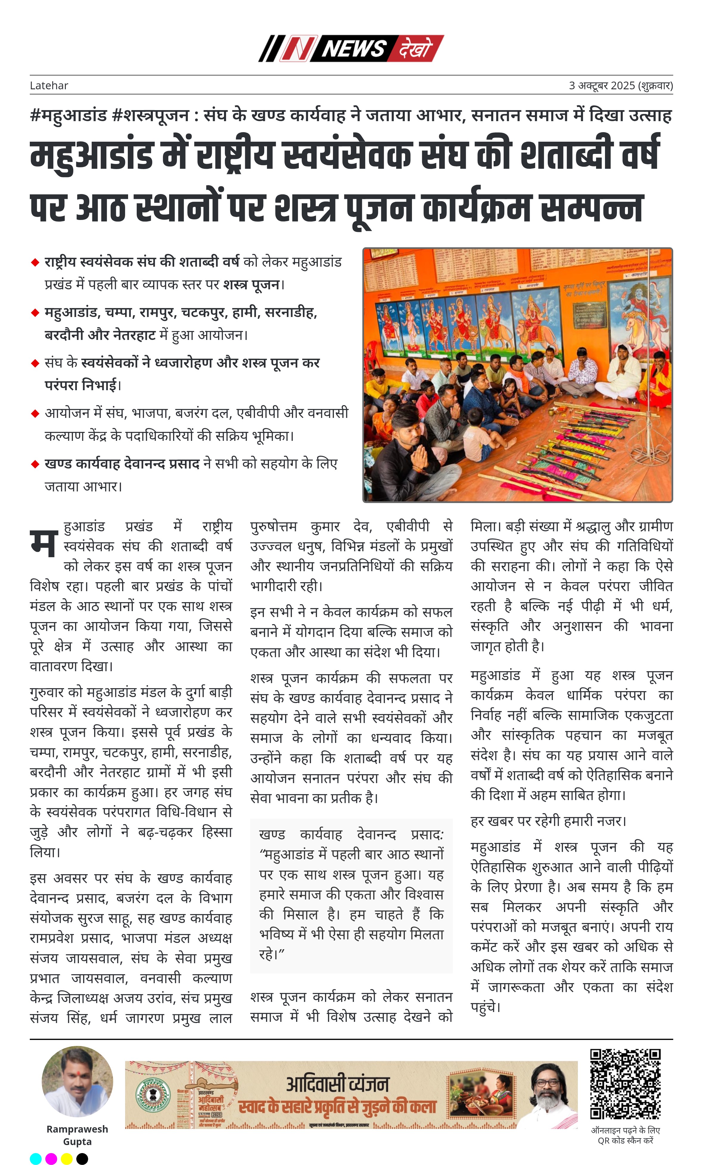 महुआडांड में हुआ यह शस्त्र पूजन कार्यक्रम केवल धार्मिक परंपरा का निर्वाह नहीं बल्कि सामाजिक एकजुटता और सांस्कृतिक पहचान का मजबूत संदेश है। संघ का यह प्रयास आने वाले वर्षों में शताब्दी वर्ष को ऐतिहासिक बनाने की दिशा में अहम साबित होगा।