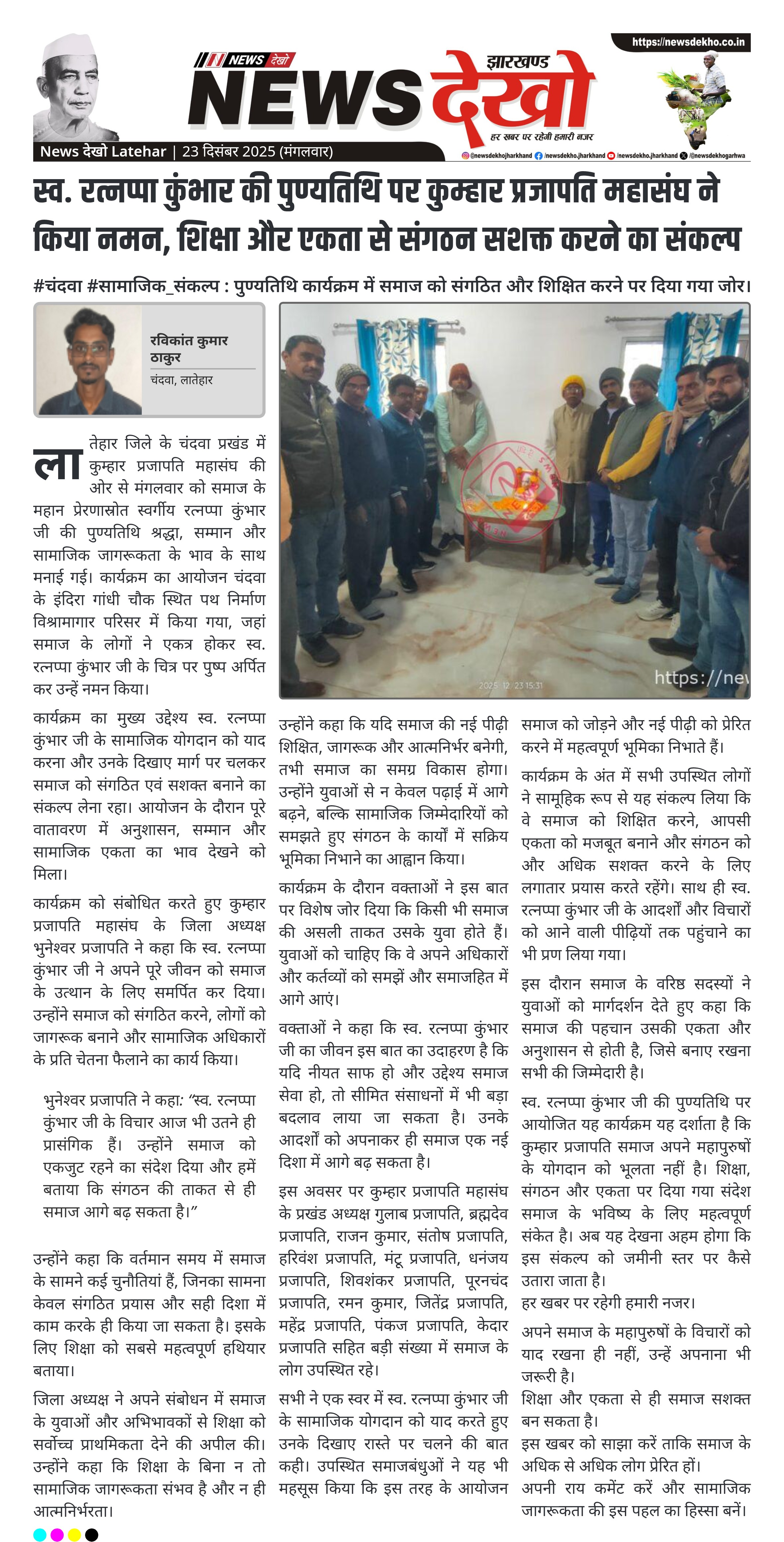 लातेहार जिले के चंदवा में कुम्हार प्रजापति महासंघ द्वारा समाज के प्रेरणास्रोत स्व. रत्नप्पा कुंभार की पुण्यतिथि श्रद्धा और संकल्प के साथ मनाई गई। कार्यक्रम में उनके सामाजिक योगदान को याद करते हुए संगठन को मजबूत करने पर चर्चा हुई। वक्ताओं ने शिक्षा को समाज की प्रगति की आधारशिला बताया। आयोजन में बड़ी संख्या में समाजबंधु शामिल हुए।