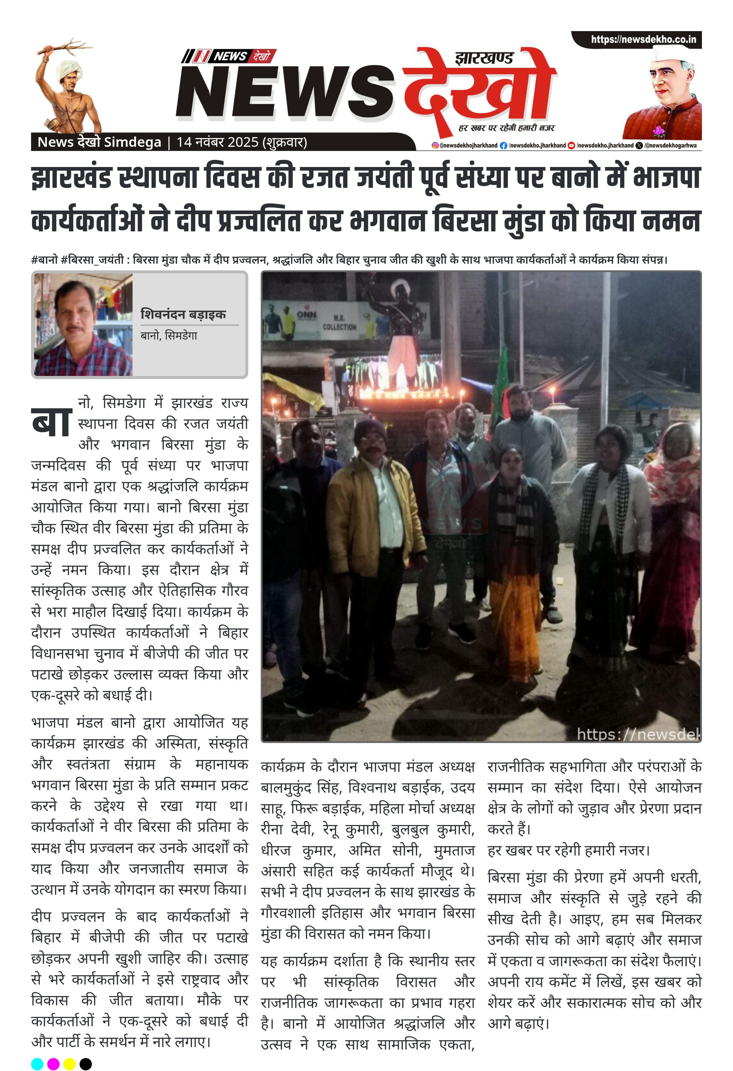 बानो, सिमडेगा में झारखंड राज्य स्थापना दिवस की रजत जयंती और भगवान बिरसा मुंडा के जन्मदिवस की पूर्व संध्या पर भाजपा मंडल बानो द्वारा एक श्रद्धांजलि कार्यक्रम आयोजित किया गया। बानो बिरसा मुंडा चौक स्थित वीर बिरसा मुंडा की प्रतिमा के समक्ष दीप प्रज्वलित कर कार्यकर्ताओं ने उन्हें नमन किया। इस दौरान क्षेत्र में सांस्कृतिक उत्साह और ऐतिहासिक गौरव से भरा माहौल दिखाई दिया। कार्यक्रम के दौरान उपस्थित कार्यकर्ताओं ने बिहार विधानसभा चुनाव में बीजेपी की जीत पर पटाखे छोड़कर उल्लास व्यक्त किया और एक-दूसरे को बधाई दी।