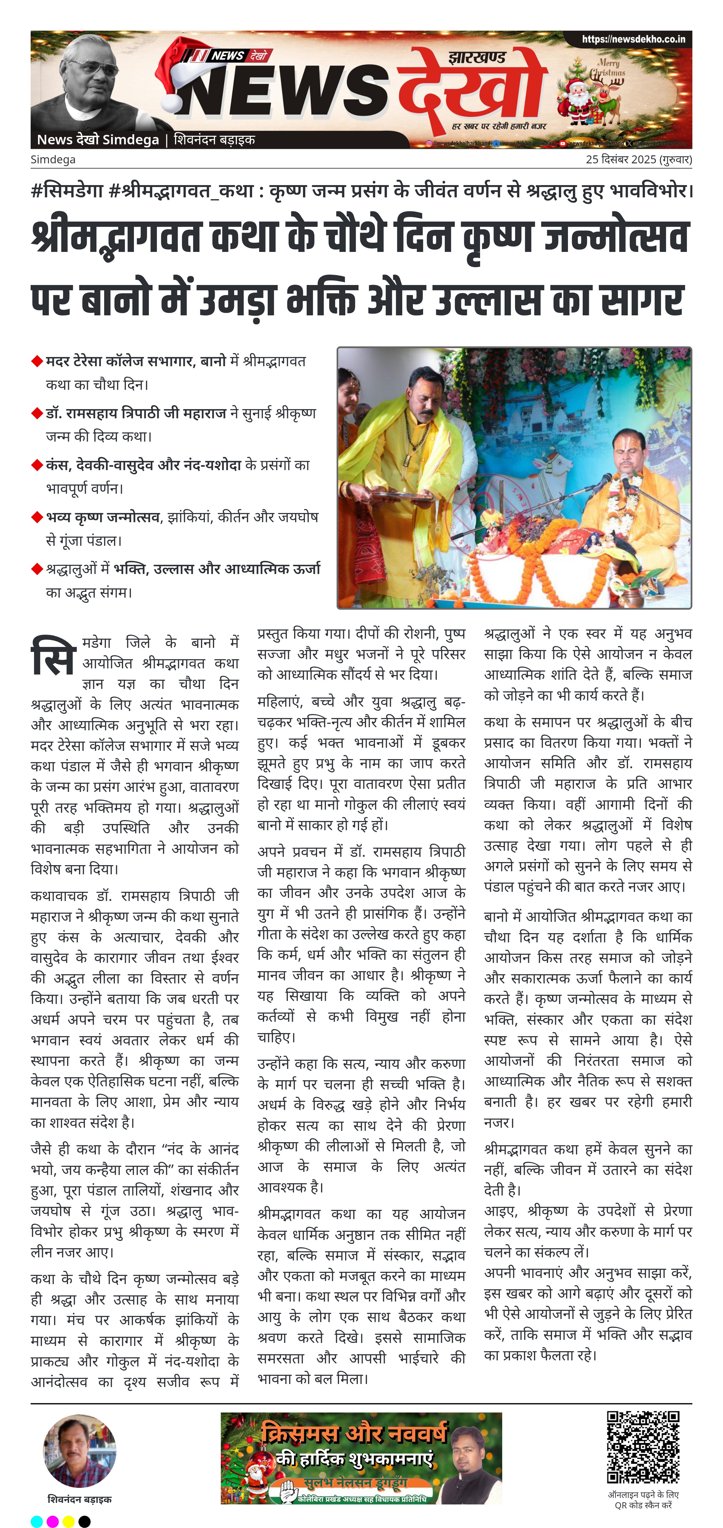 सिमडेगा जिले के बानो में आयोजित श्रीमद्भागवत कथा ज्ञान यज्ञ का चौथा दिन श्रद्धालुओं के लिए अत्यंत भावनात्मक और आध्यात्मिक अनुभूति से भरा रहा। मदर टेरेसा कॉलेज सभागार में सजे भव्य कथा पंडाल में जैसे ही भगवान श्रीकृष्ण के जन्म का प्रसंग आरंभ हुआ, वातावरण पूरी तरह भक्तिमय हो गया। श्रद्धालुओं की बड़ी उपस्थिति और उनकी भावनात्मक सहभागिता ने आयोजन को विशेष बना दिया।