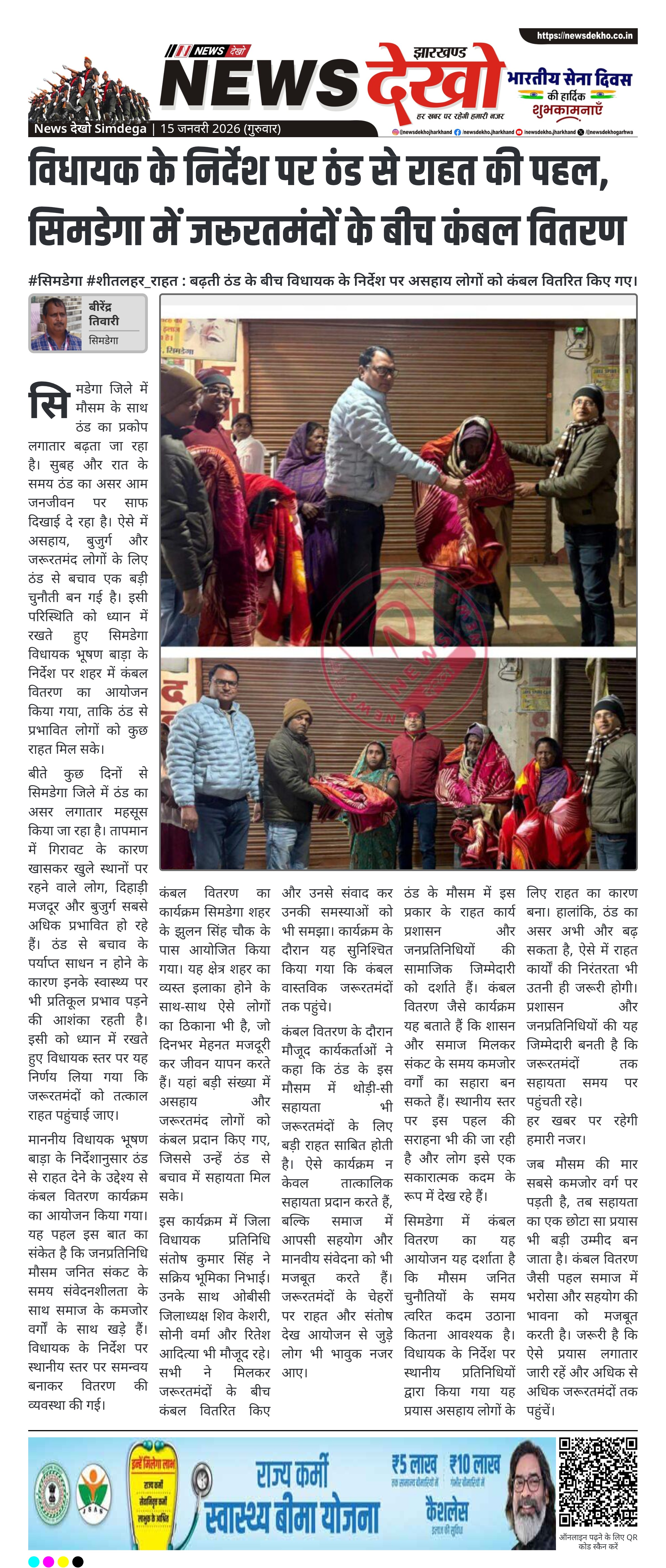 बीते कुछ दिनों से सिमडेगा जिले में ठंड का असर लगातार महसूस किया जा रहा है। तापमान में गिरावट के कारण खासकर खुले स्थानों पर रहने वाले लोग, दिहाड़ी मजदूर और बुजुर्ग सबसे अधिक प्रभावित हो रहे हैं। ठंड से बचाव के पर्याप्त साधन न होने के कारण इनके स्वास्थ्य पर भी प्रतिकूल प्रभाव पड़ने की आशंका रहती है। इसी को ध्यान में रखते हुए विधायक स्तर पर यह निर्णय लिया गया कि जरूरतमंदों को तत्काल राहत पहुंचाई जाए।