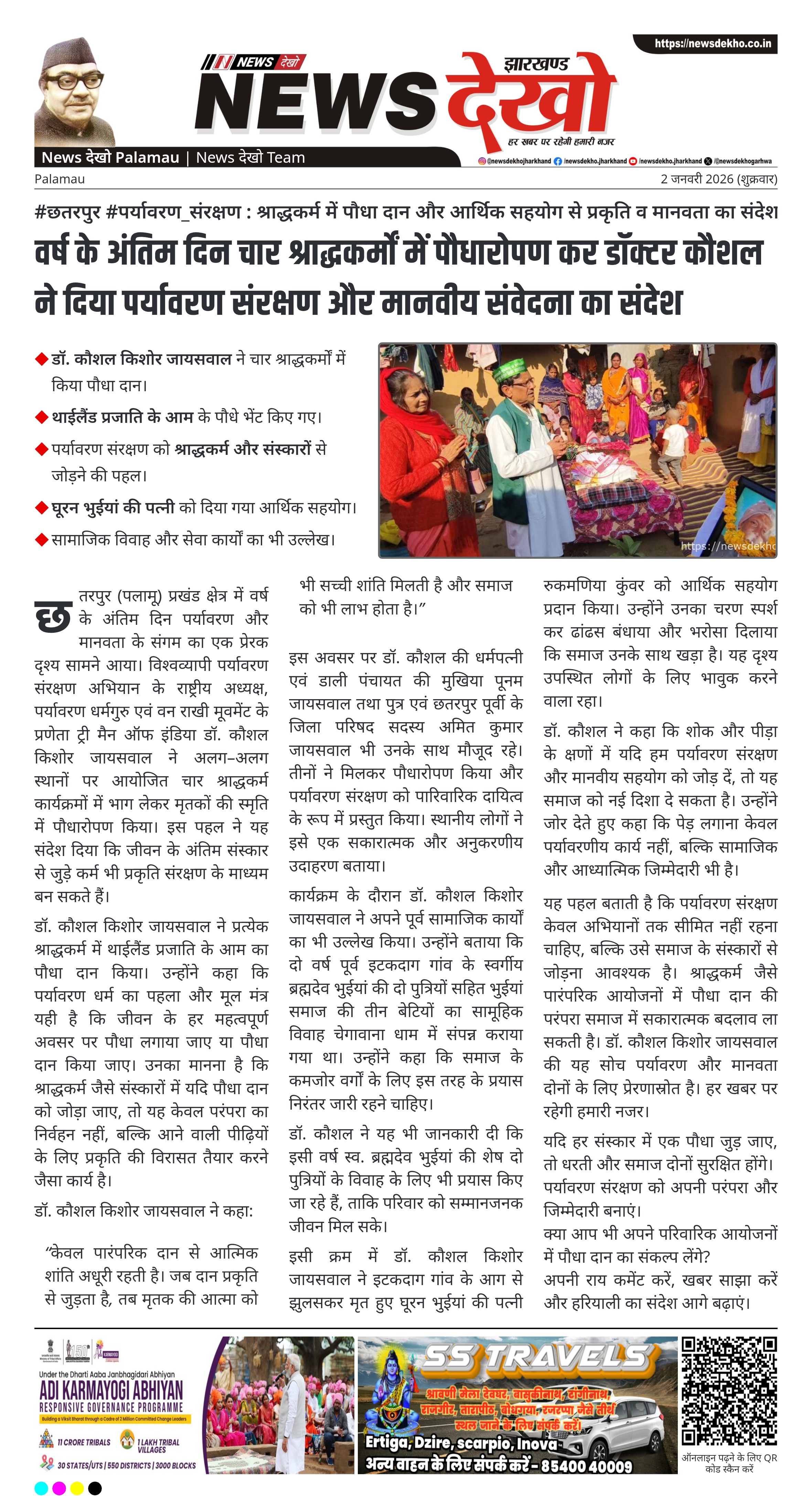 छतरपुर (पलामू) प्रखंड क्षेत्र में वर्ष के अंतिम दिन पर्यावरण और मानवता के संगम का एक प्रेरक दृश्य सामने आया। विश्वव्यापी पर्यावरण संरक्षण अभियान के राष्ट्रीय अध्यक्ष, पर्यावरण धर्मगुरु एवं वन राखी मूवमेंट के प्रणेता ट्री मैन ऑफ इंडिया डॉ. कौशल किशोर जायसवाल ने अलग–अलग स्थानों पर आयोजित चार श्राद्धकर्म कार्यक्रमों में भाग लेकर मृतकों की स्मृति में पौधारोपण किया। इस पहल ने यह संदेश दिया कि जीवन के अंतिम संस्कार से जुड़े कर्म भी प्रकृति संरक्षण के माध्यम बन सकते हैं।