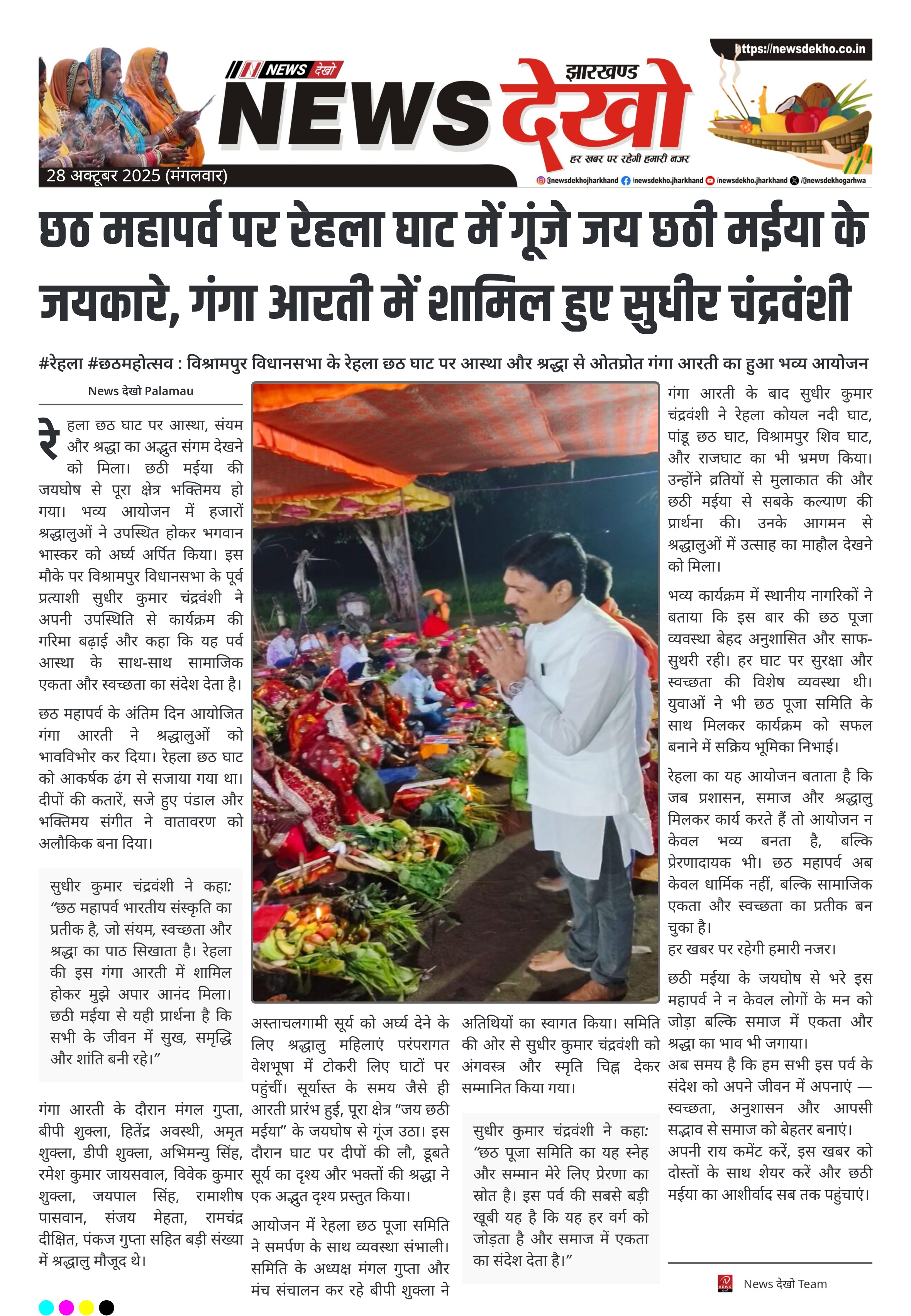 सुधीर कुमार चंद्रवंशी ने कहा: “छठ महापर्व भारतीय संस्कृति का प्रतीक है, जो संयम, स्वच्छता और श्रद्धा का पाठ सिखाता है। रेहला की इस गंगा आरती में शामिल होकर मुझे अपार आनंद मिला। छठी मईया से यही प्रार्थना है कि सभी के जीवन में सुख, समृद्धि और शांति बनी रहे।”