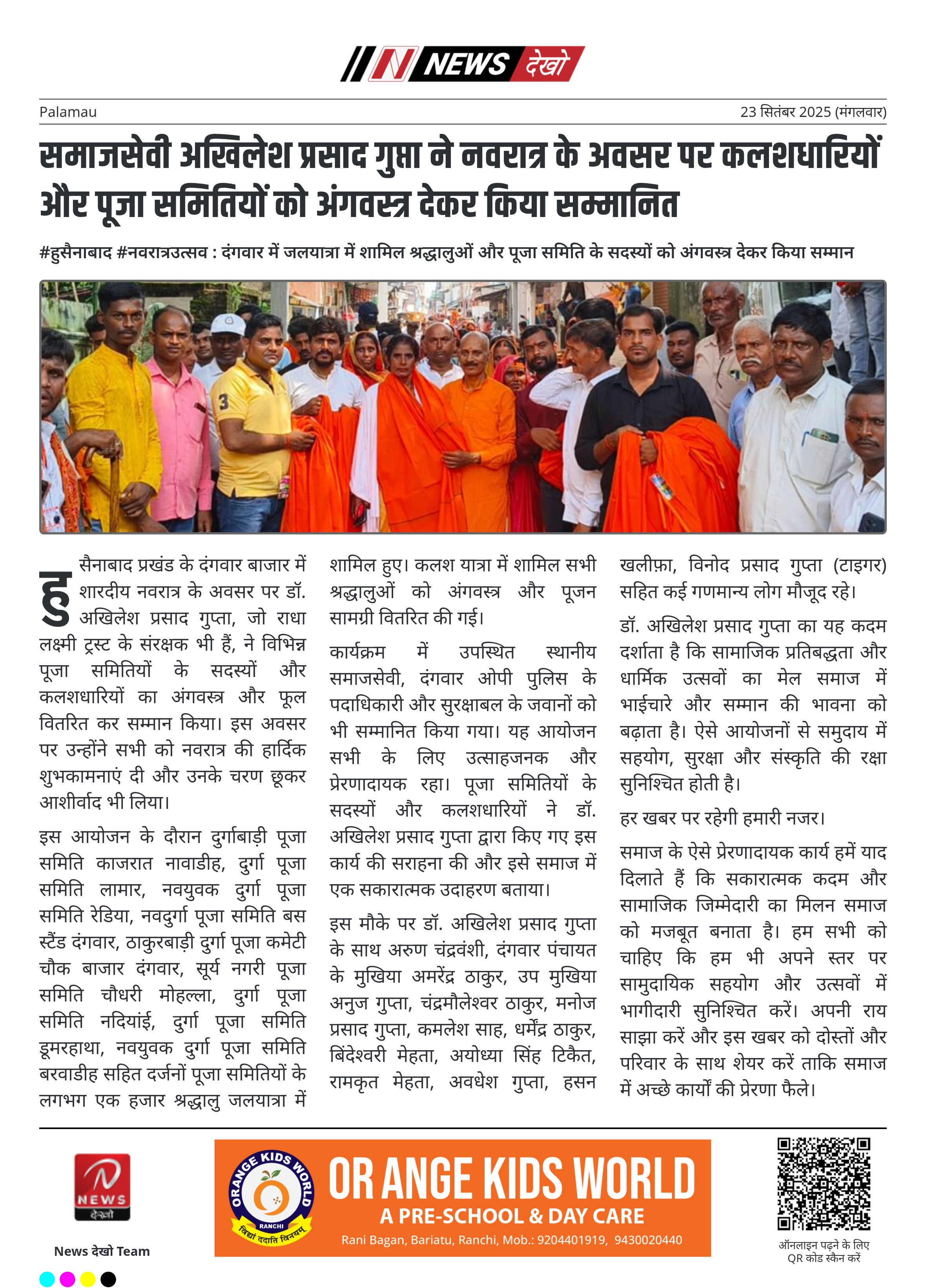 - डॉ. अखिलेश प्रसाद गुप्ता ने नवरात्र के अवसर पर कलशधारियों को अंगवस्त्र और फूल देकर सम्मानित किया।