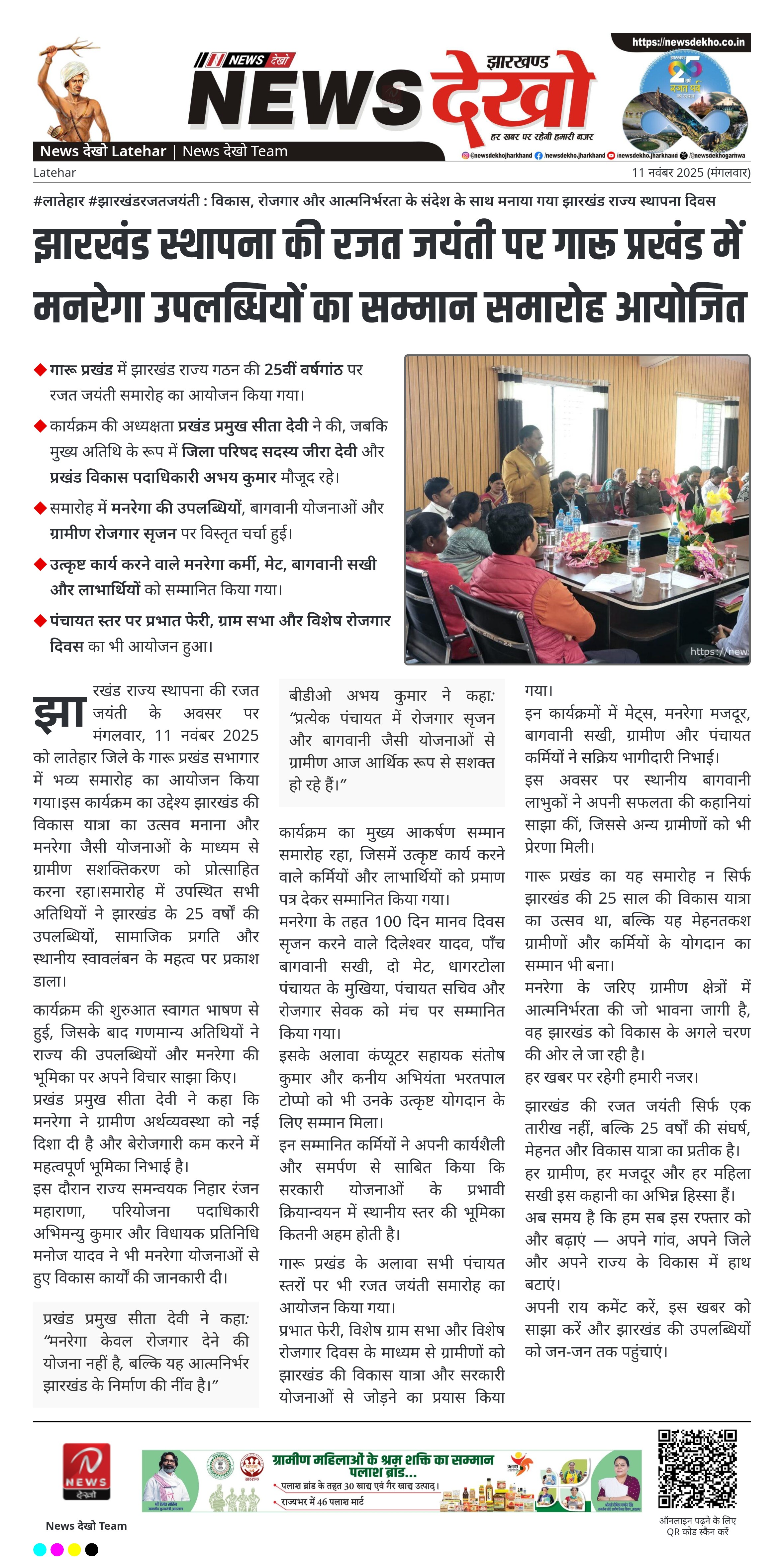 झारखंड राज्य स्थापना की रजत जयंती के अवसर पर मंगलवार, 11 नवंबर 2025 को लातेहार जिले के गारू प्रखंड सभागार में भव्य समारोह का आयोजन किया गया।